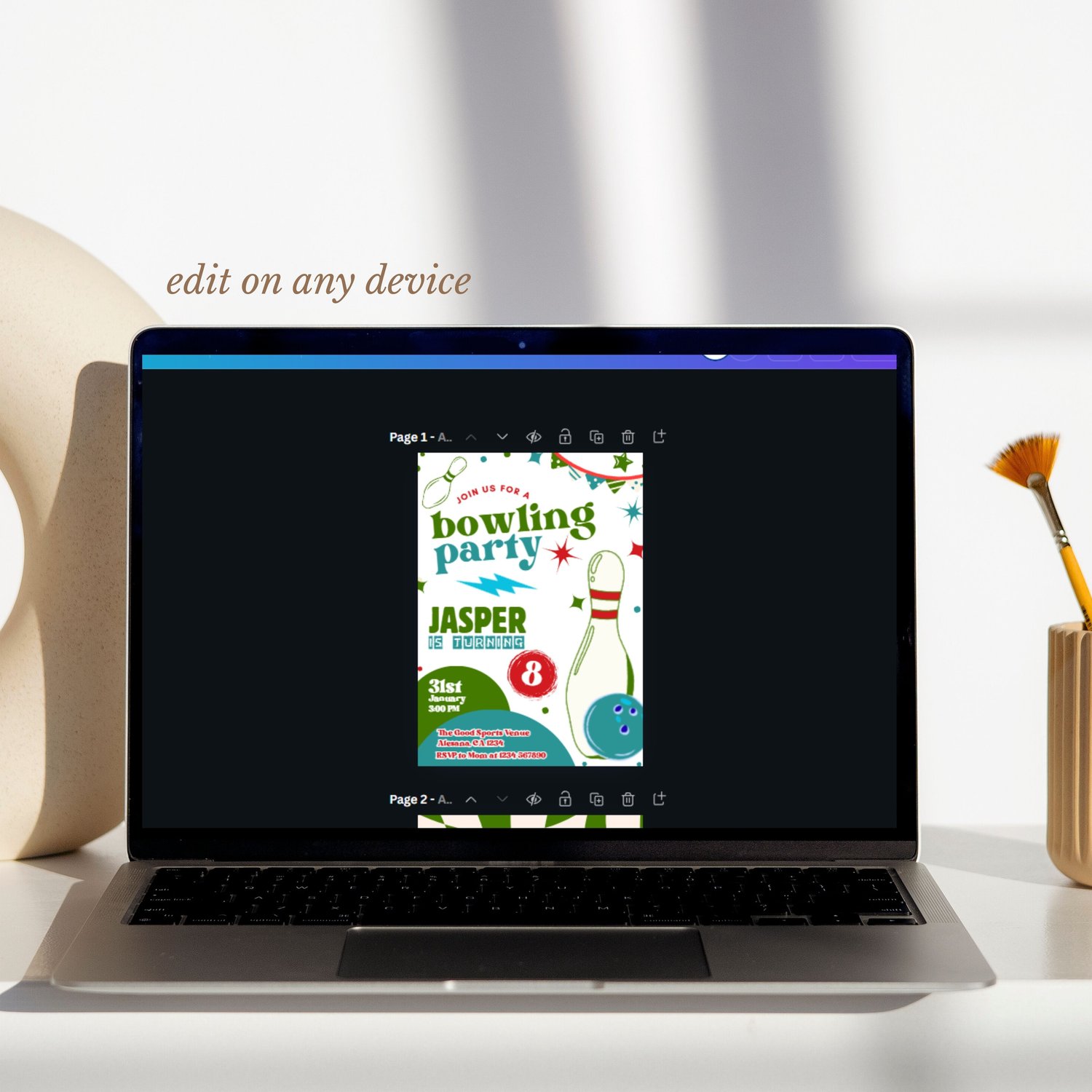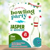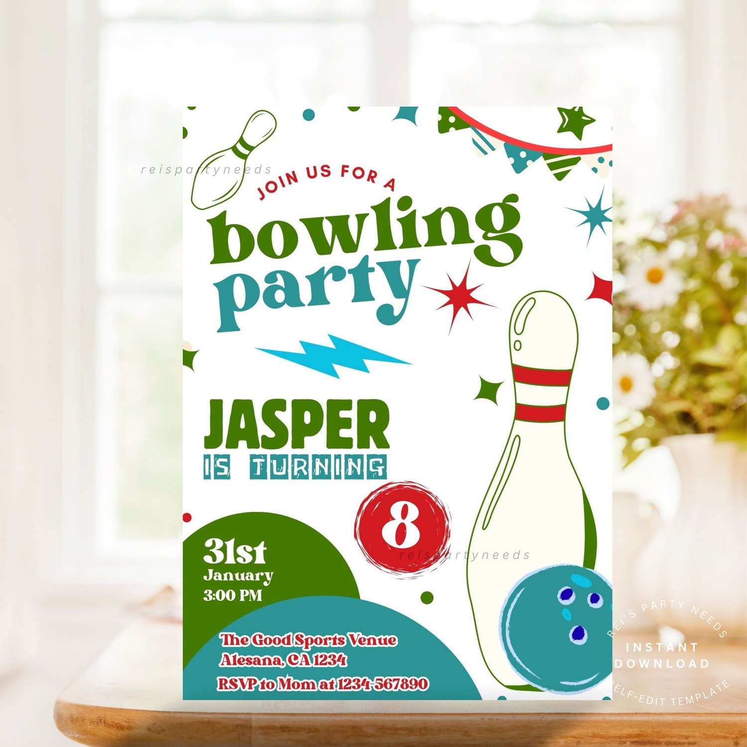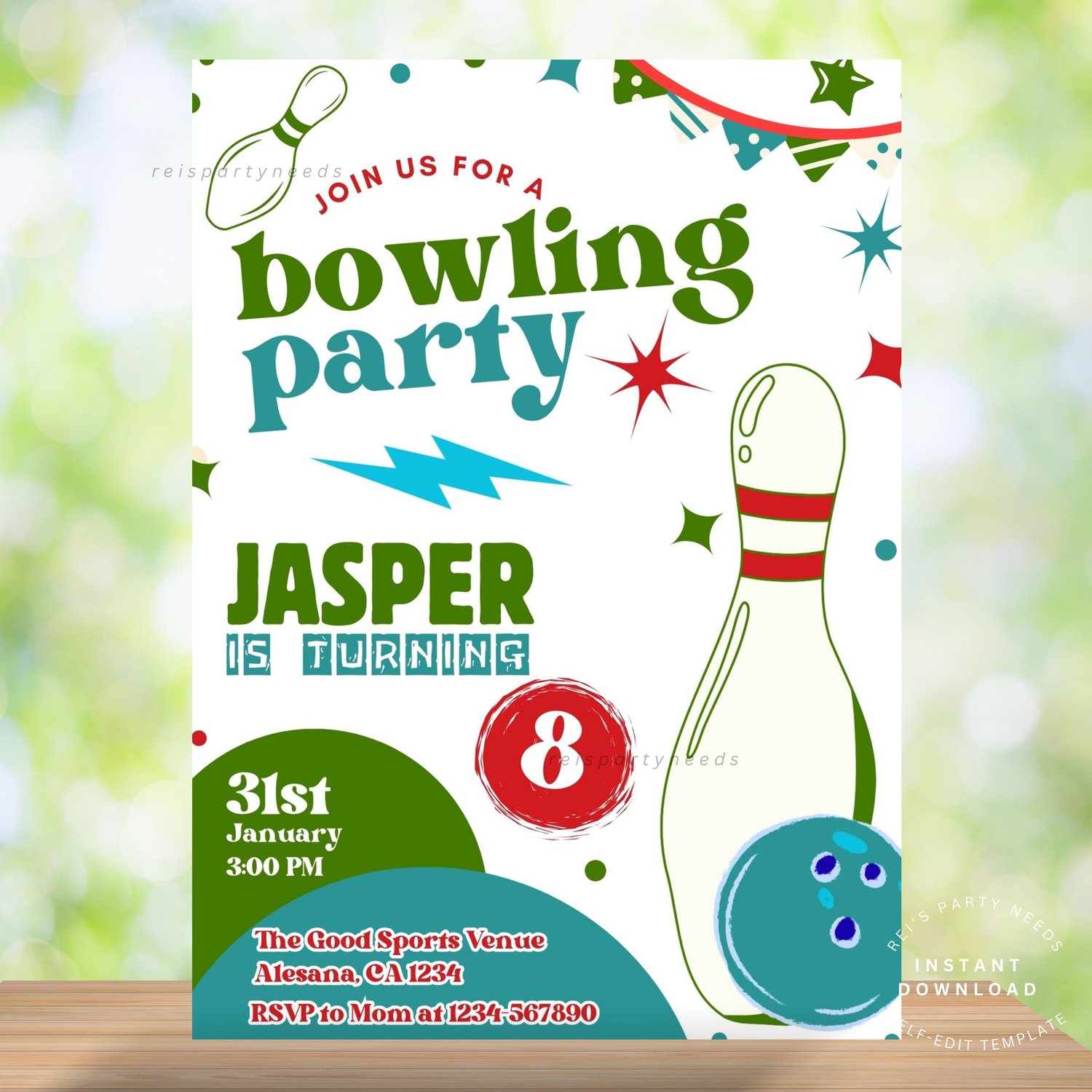 Blue Green Bowling Birthday Party Invitation Template | Editable Canva Design for Kids Bowling Alley Celebration | Fun and Customizable Invite, Custom