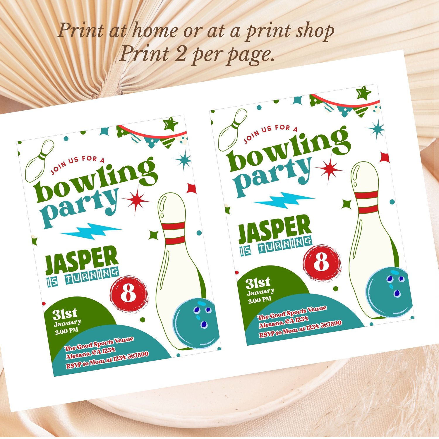 Editable Bowling Birthday Invitation Template, Printable Strike Up Some Fun Birthday Party Invitations, Green Blue Boy Bowling Invite Card