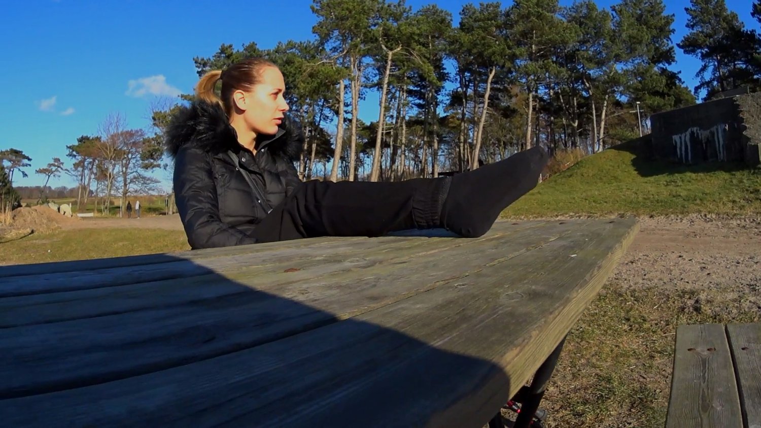 Sunshine is on her way down to the beach today to enjoy some “sunshine” as she crutches slowly on the dirty path with her broken and casted foot. She makes it down to the beach safely and crutches to a bench where she can take a little rest as a superb closeup of her casted foot is done on the table. After the closeup went on for a while Sunshine bends forward to remove her sock from the cast, now we can finally take a really close look of her black SLC as her bare toes sticks out from it. The closeup then went on for a little longer, catching very hot views of Sunshine’s leg from all sides. She then lights a cigarette as she enjoys herself out here before she has to get back again. We can’t get enough of the closeups!