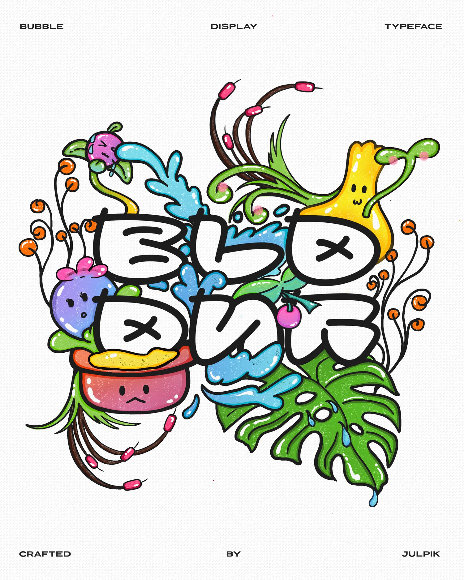 Bloonk is a bubble display typeface. This typeface contains Uppercases, Lowercases. This typeface is also has outline and fill version. Every Letter is unique since it's made with my experimental about bubble letters. This typeface is suitable for logotype, merch design, or anything fun!