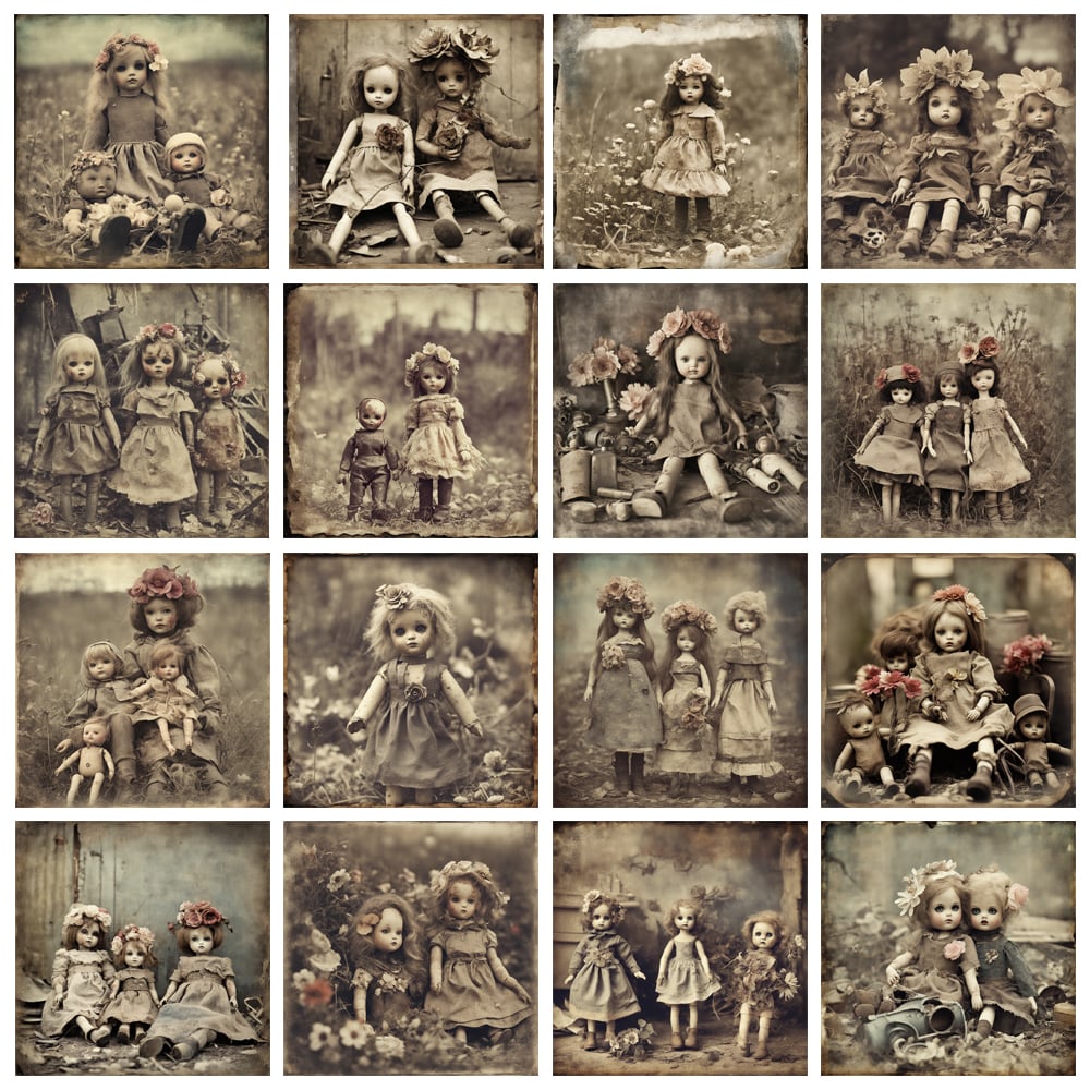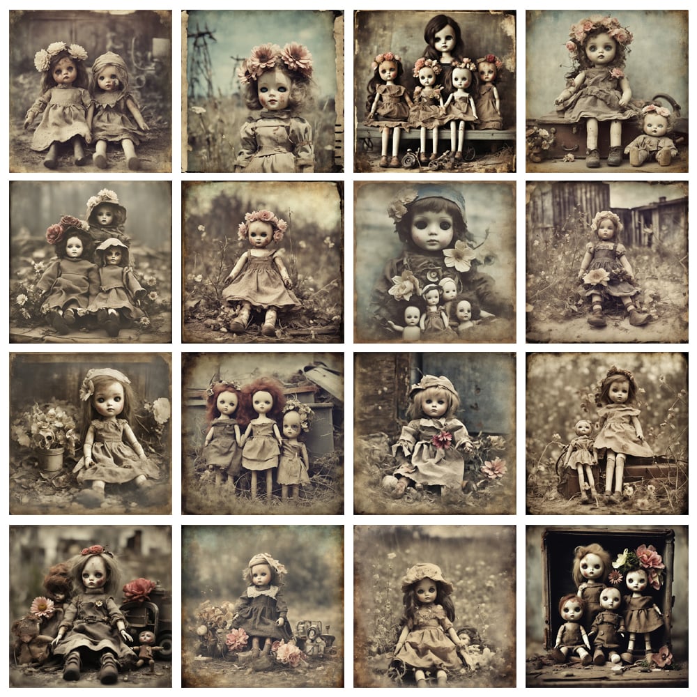 32 images of damaged “ugly” dolls with a vintage aesthetic. This images evoke a haunted feeling that's perfect for Halloween designs, book designs, digital media, social media banners, posters, wallpapers, scrapbooking, cards, journals, Graphic design projects, and more.