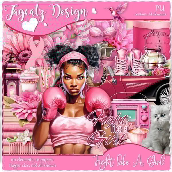 Fight Like A Girl - This one's a Breast Cancer Awareness kit, but can be used for lots of other things too! 101 elements and 10 papers. Contains AI elements. Tagger size. PU only.