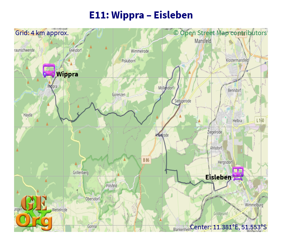 European Long Distance Hiking Path E11, Wippra - Eisleben, one GPX file,GeoJSON file, one OpenStreetMap image.