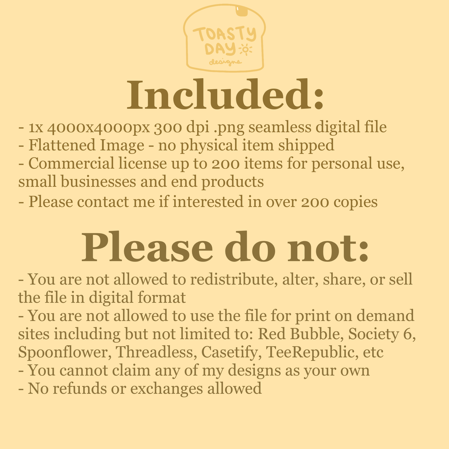 - You are NOT allowed to use the file for print on demand sites including but not limited to Red Bubble, Society 6, Spoonflower, Threadless, Casetify, Tee Republic, etc