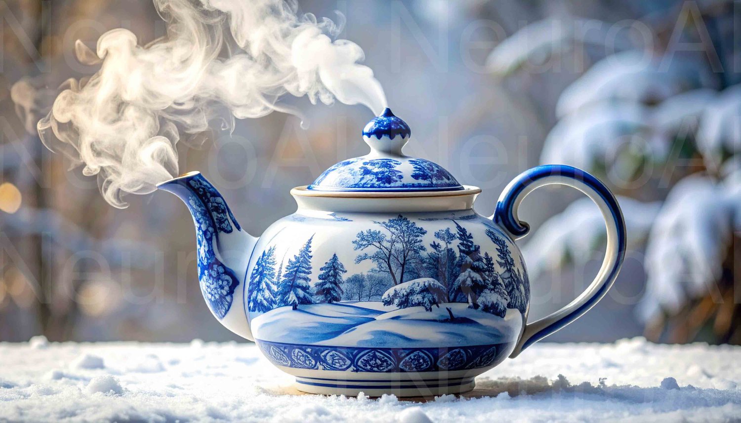 Warm tea steams on snowy day, a cozy winter scene