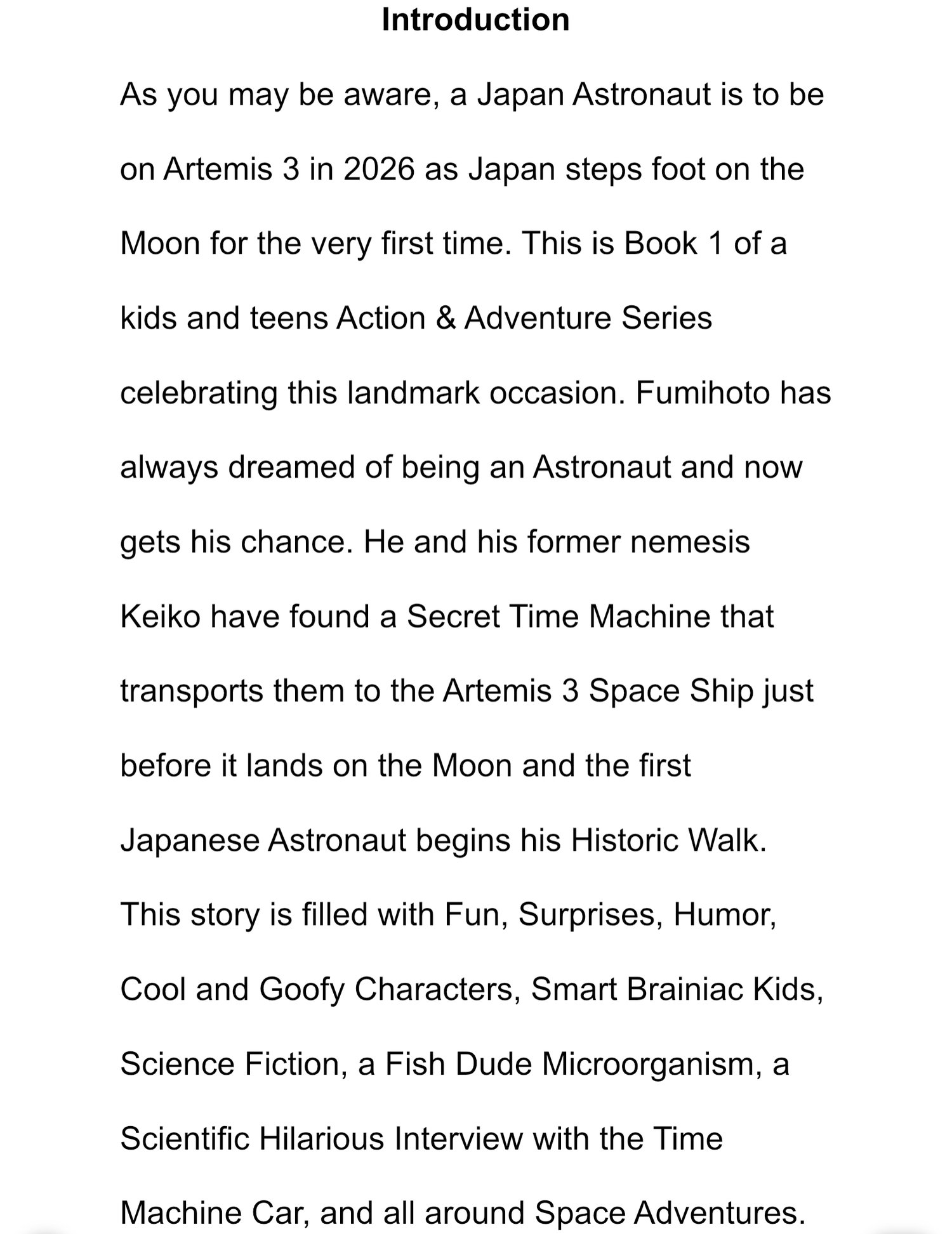 Free Audio Preview! (Book and Audio plus Free Star Love Broadcast Spinning Sticker!) Book #1 of a Series. As you may be aware, a Japan Astronaut is to be on Artemis 3 in 2026 as Japan steps foot on the Moon for the very first time. This is Book 1 of a kids and teens Action & Adventure Series celebrating this landmark occasion. Fumihoto has always dreamed of being an Astronaut and now gets his chance. He and his former nemesis Keiko have found a Secret Time Machine that transports them to the Artemis 3 Space Ship just before it lands on the Moon and the first Japanese Astronaut begins his Historic Walk. This story is filled with Fun, Surprises, Humor, Cool and Goofy Characters, Smart Brainiac Kids, Science Fiction, a Fish Dude Microorganism, a Scientific Hilarious Interview with the Time Machine Car, and all around Space Adventures.