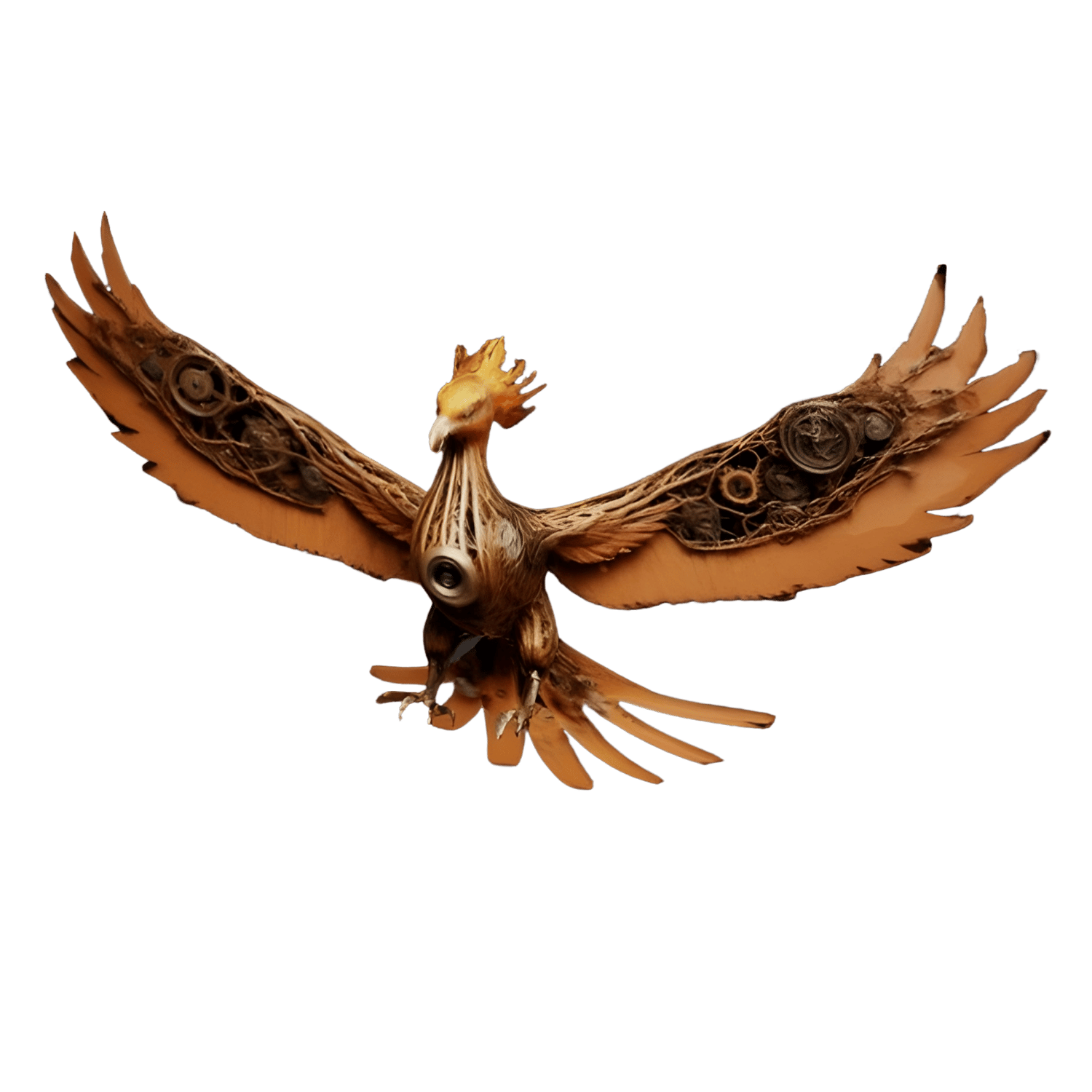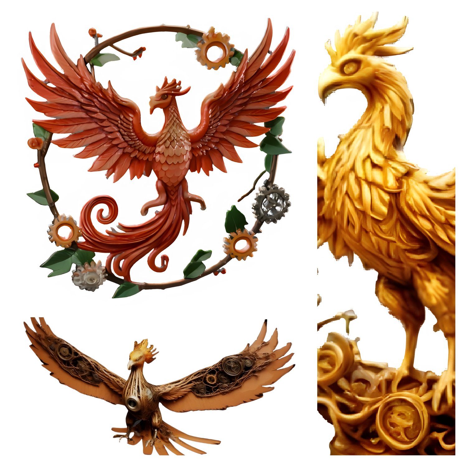 - Steampunk Phoenix: A gorgeous copper-toned phoenix with mechanical gears and organic vine elements. Perfect for steampunk enthusiasts! The intricate gear details and leafy accents would require careful support structures during printing.