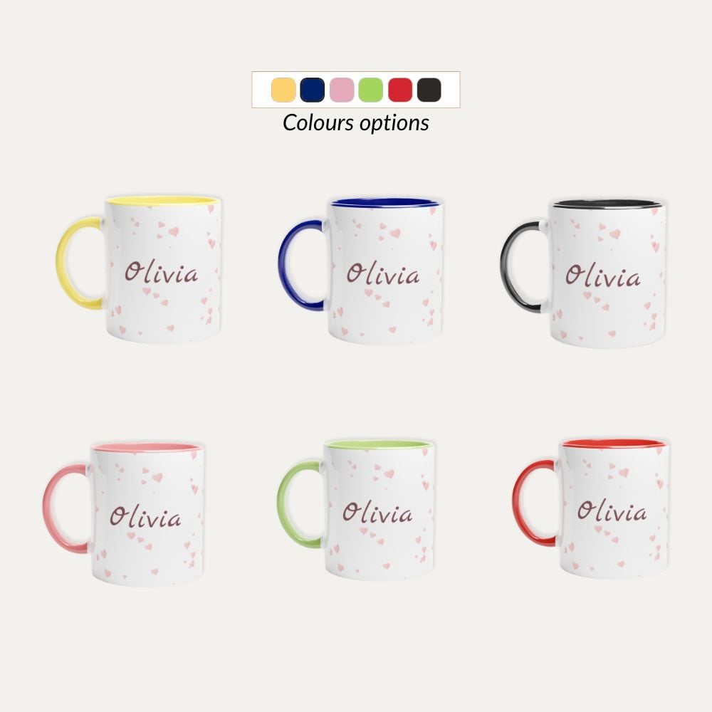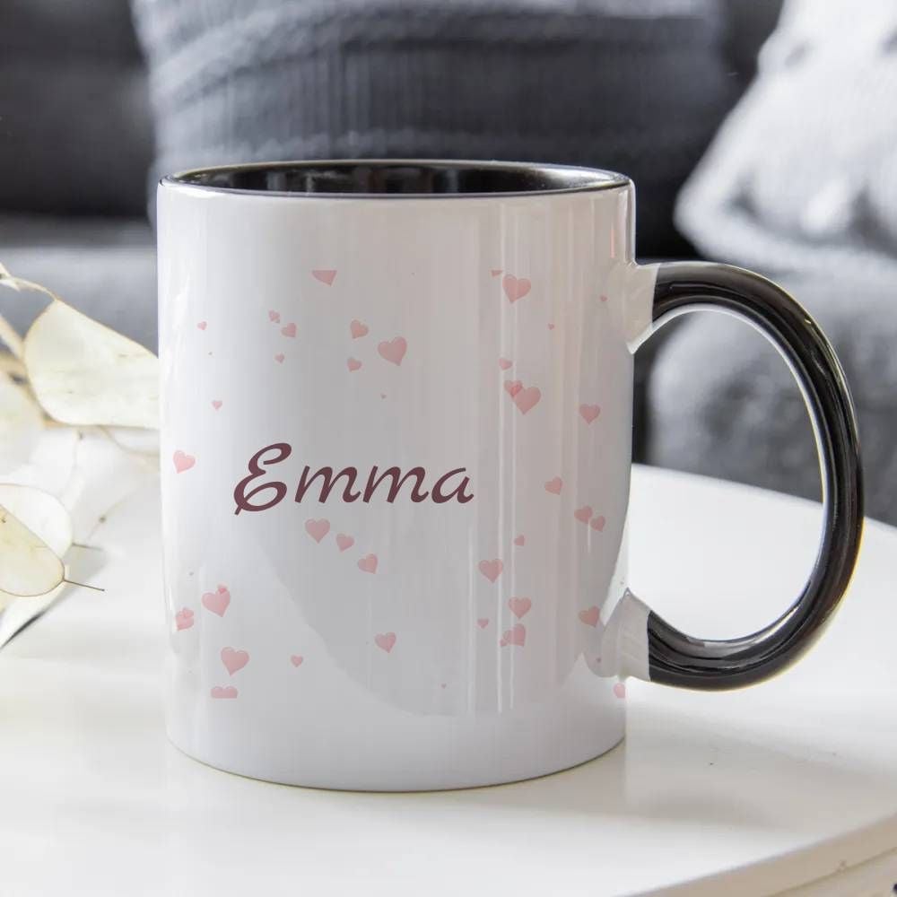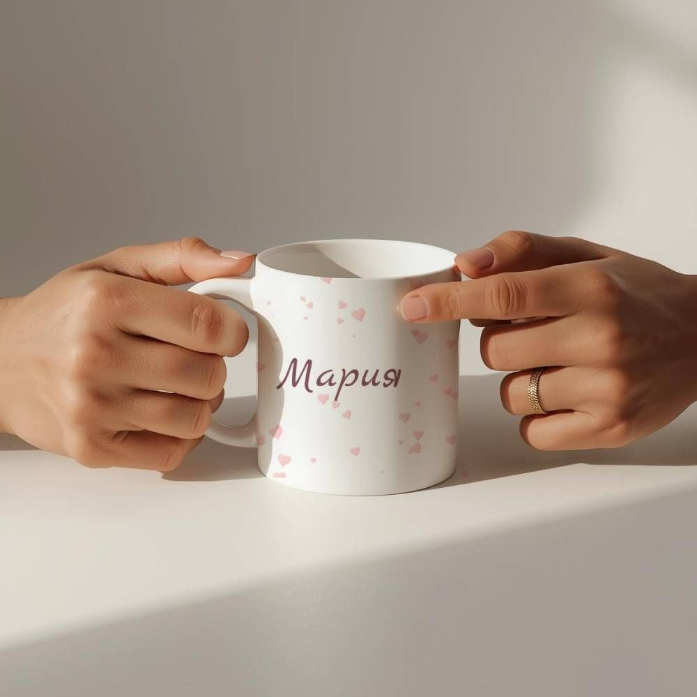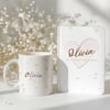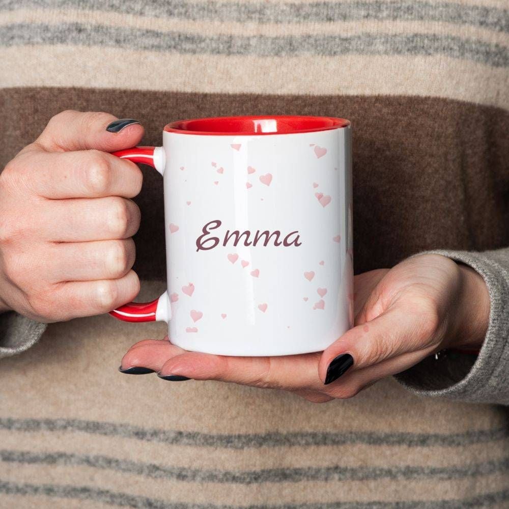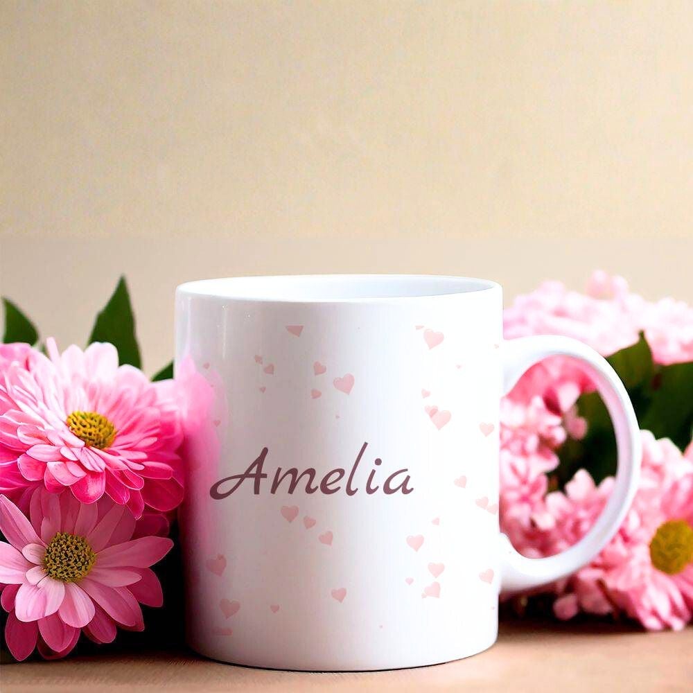 A soft and elegant personalised mug with delicate heart details and a name of your choice / Нежна и елегантна персонализирана чаша със деликатни сърчица и име по избор.
