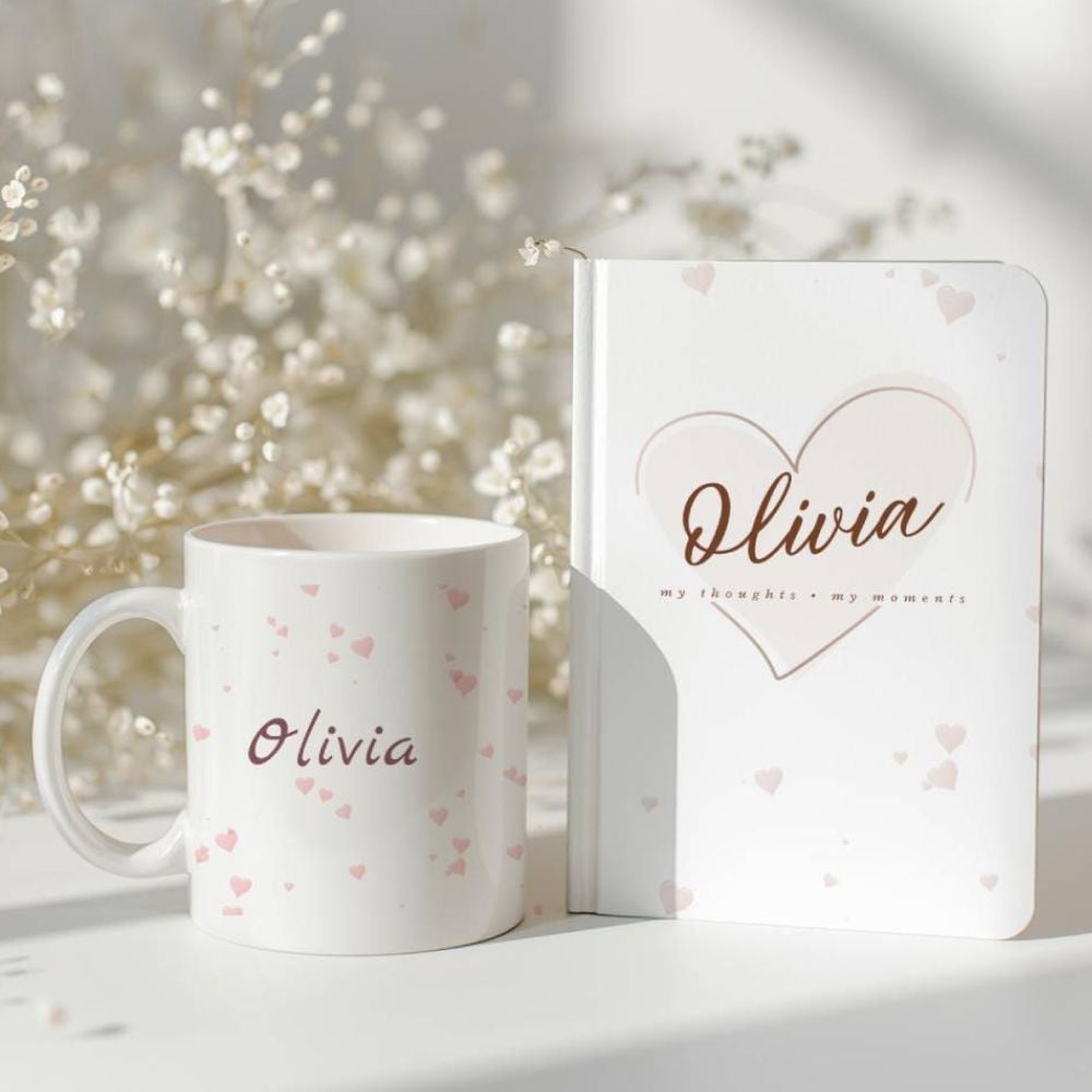 This mug can be paired with a personalised notebook featuring the same delicate heart design.
