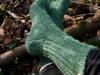 Ce sont des chaussettes toe-up (des orteils vers la cheville). Le talon renforcé en rangs raccourcis et le gousset sont entièrement adaptables à votre cou-de-pied avec quelques calculs expliqués au début de ce patron. La tige se termine par un revers doublé en côtes façon dents de chat.