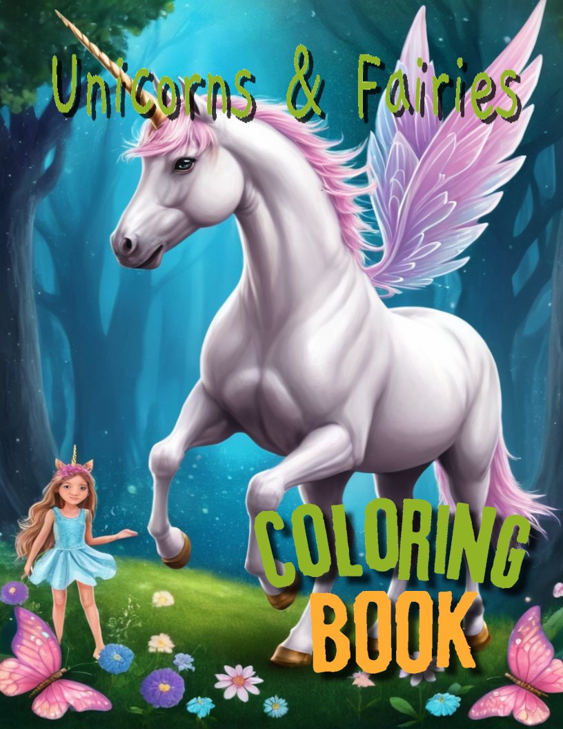 This children’s coloring book is full of happy, smiling, beautiful unicorns and fairies.
