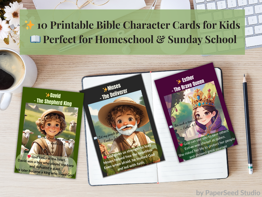 This beautifully designed printable card set introduces children to 10 inspiring Bible characters, from Ruth and David to Esther and Samuel. Each card features a vibrant illustration, a powerful Bible verse, and a short life lesson written in child-friendly language.