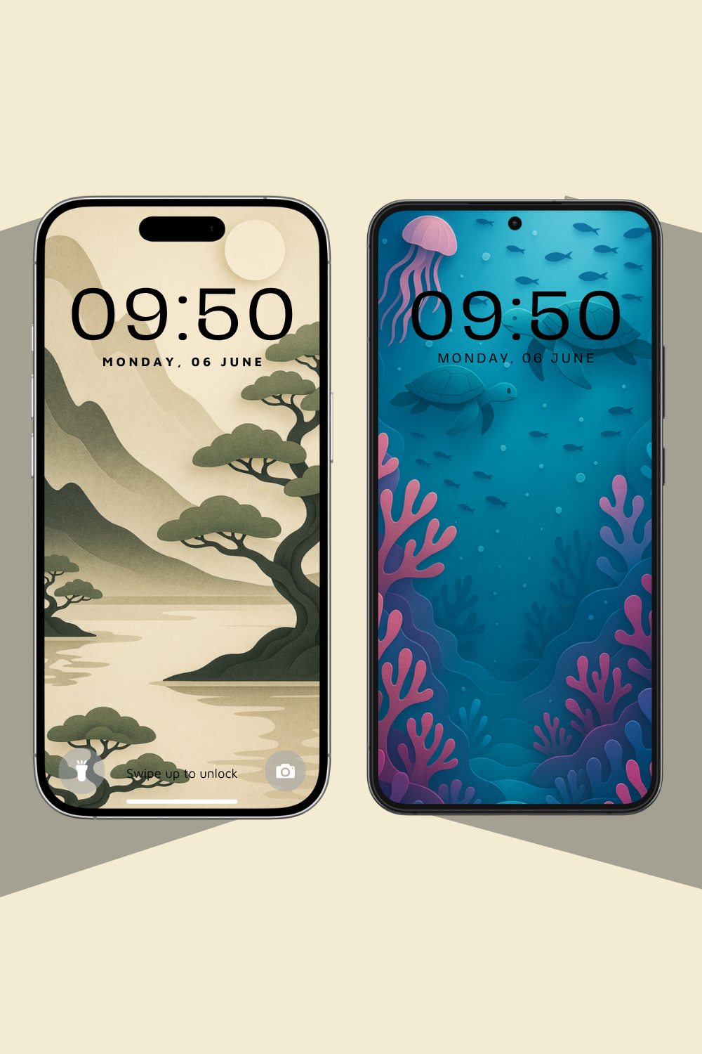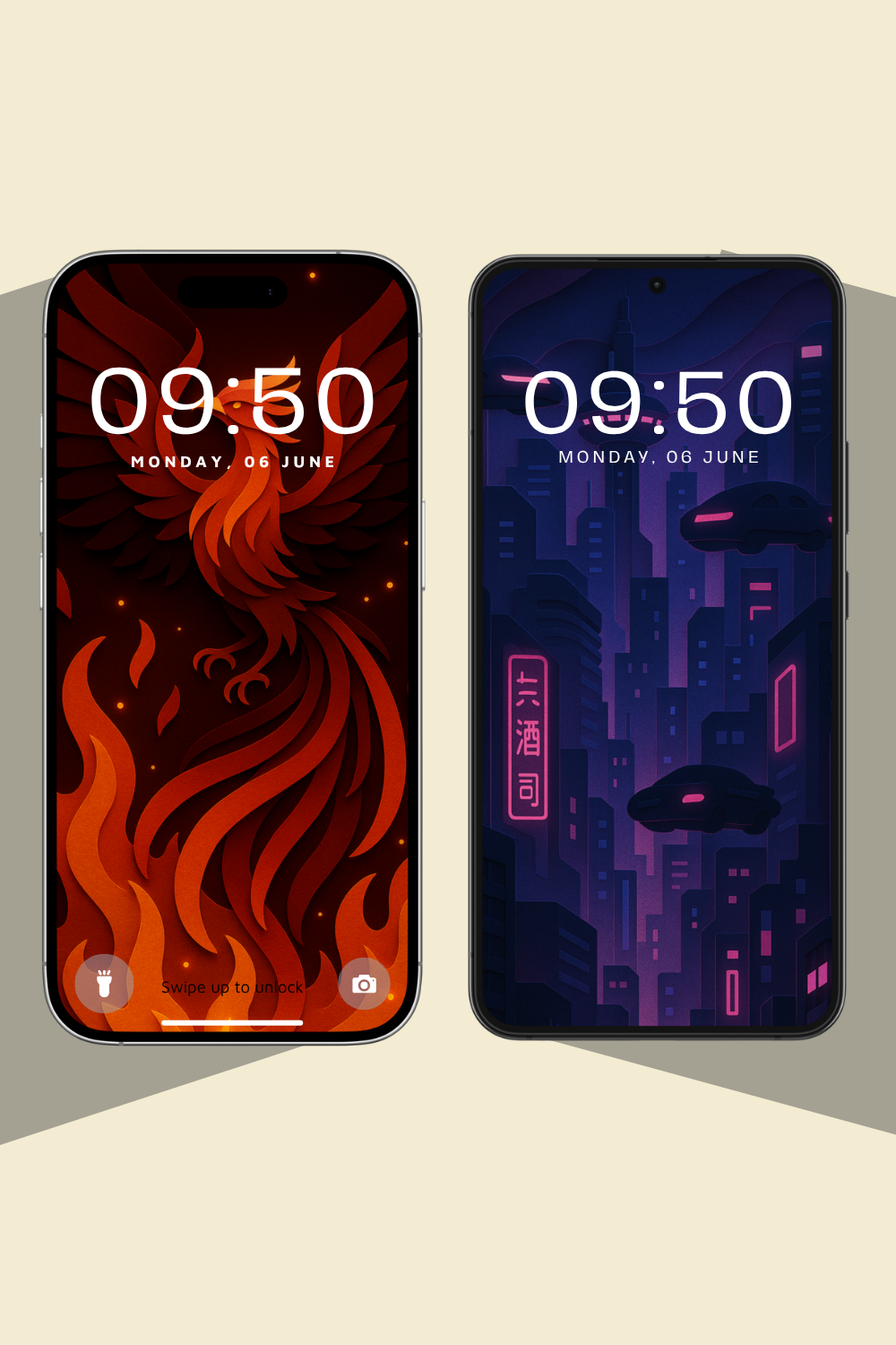 Each design is available in two high-resolution formats to perfectly fit both standard Android (1080x1920) and iPhone (1284x2776) screens. Whether you're into serene landscapes, fiery motifs, or dreamy skylines, this pack has something for every vibe.