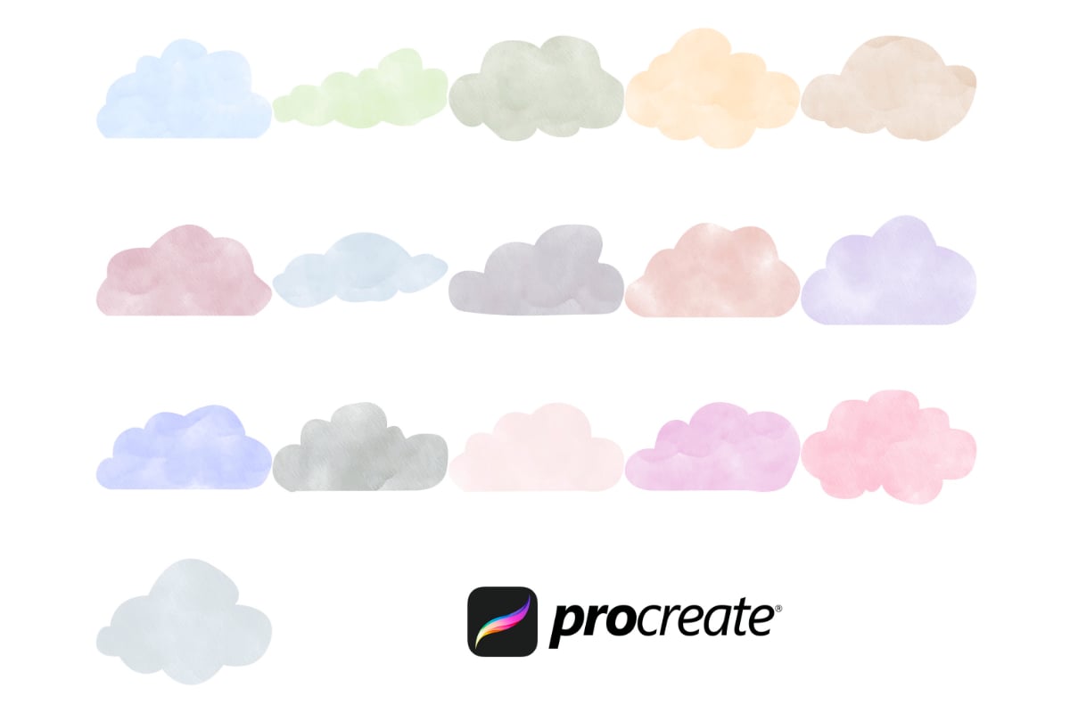 Watercolour Clouds Set 1 Procreate Brush Stamps, 16 Clouds