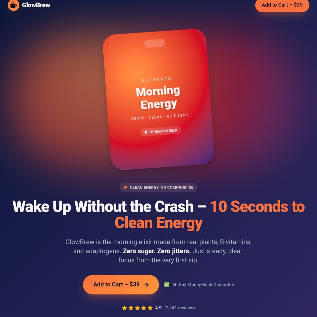 GlowBrew is a modern, conversion‑optimized landing page built specifically for selling one flagship product (digital or physical). It combines a powerful hero section, visual benefits, authentic testimonials, real‑time scarcity indicators, and dual CTAs — all wrapped in a clean, attention‑grabbing dark navy + orange color scheme.