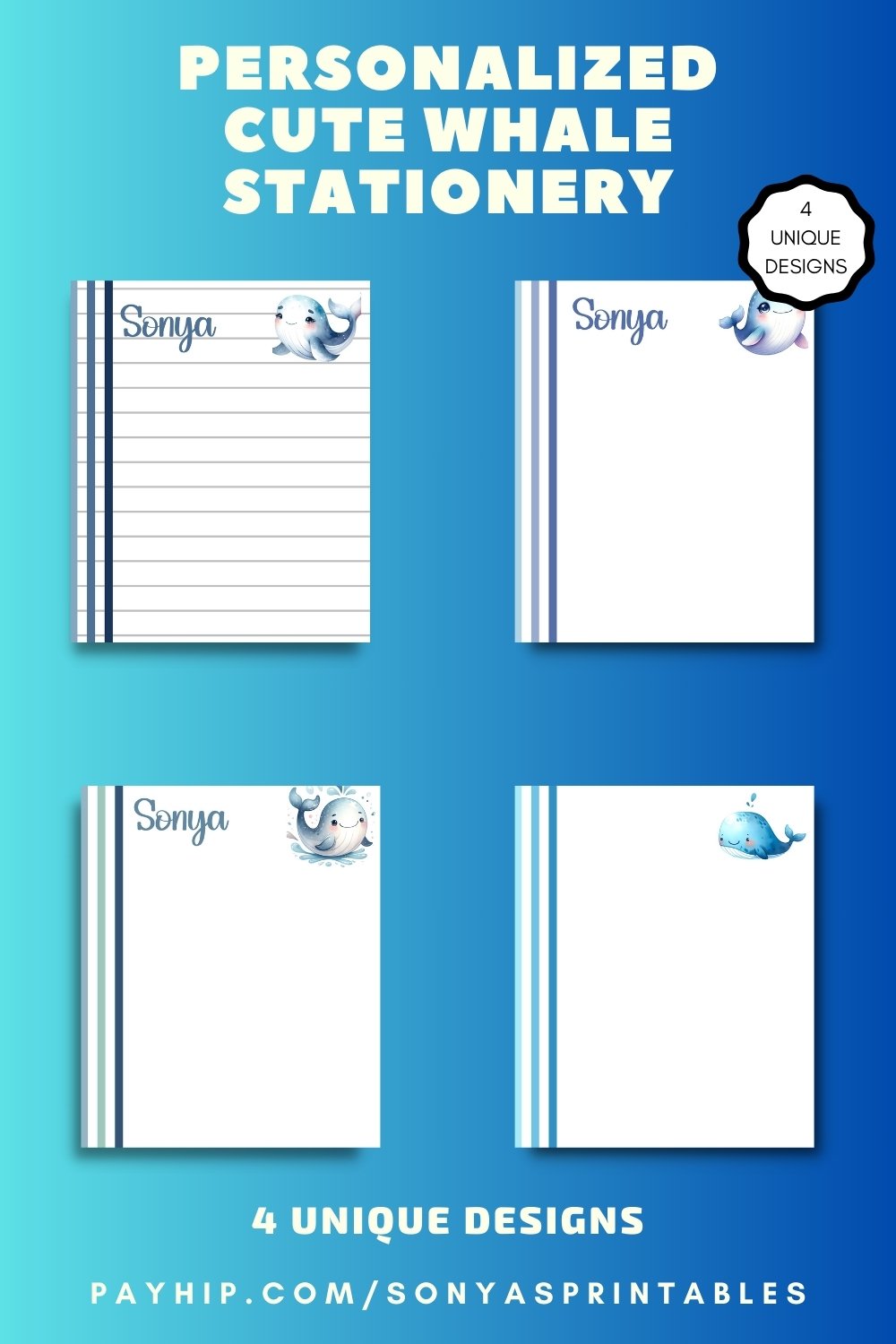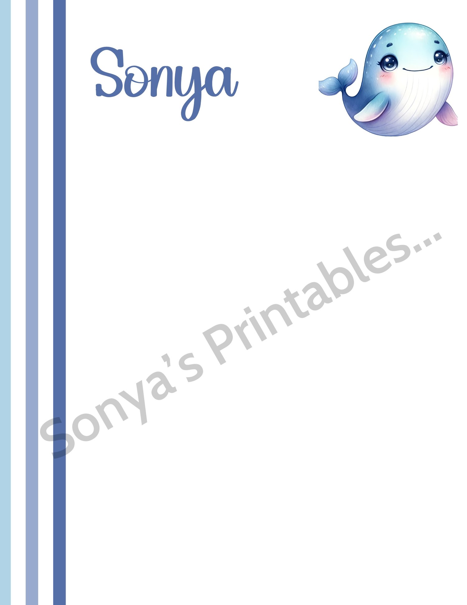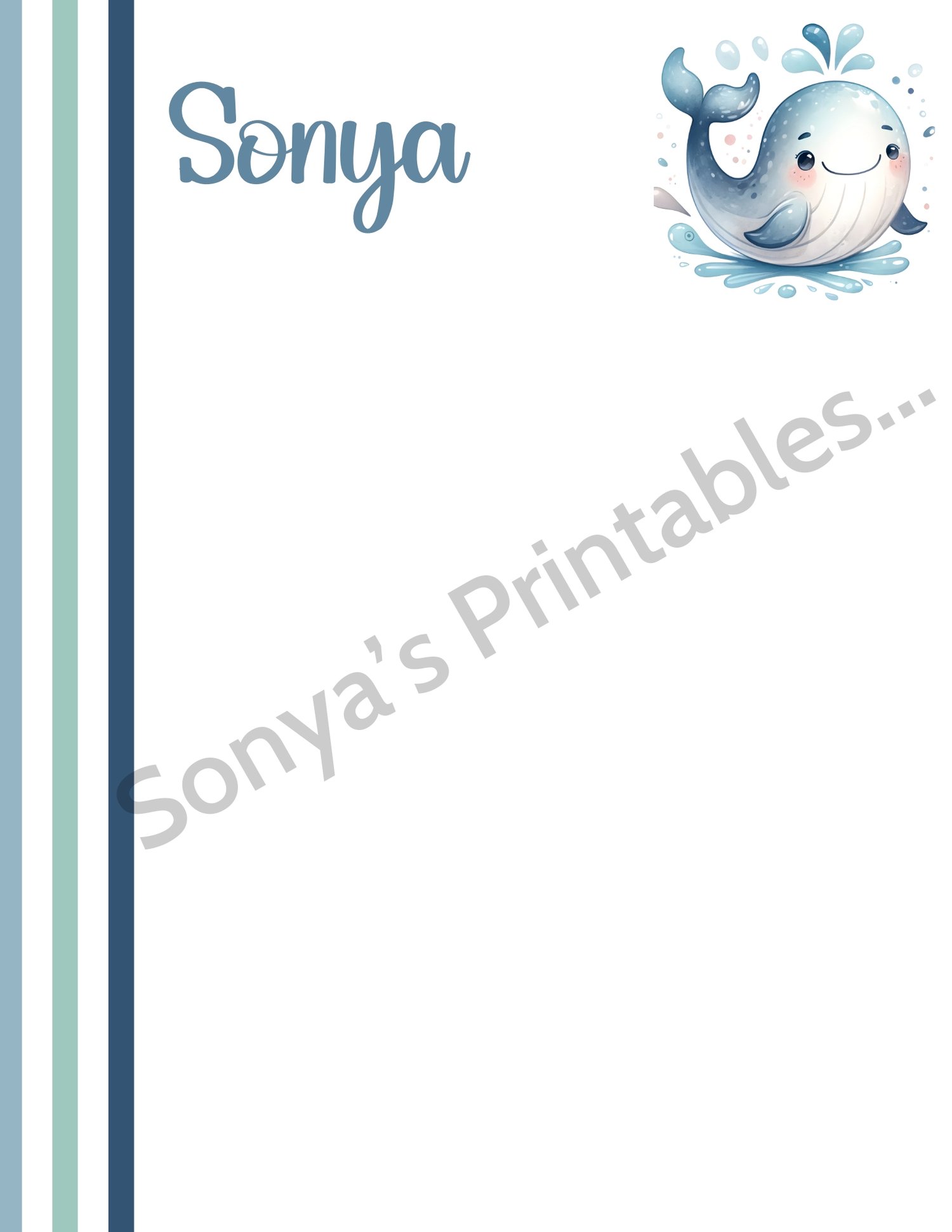 You'll be able to instantly download these to your device after your payment is received. This Personalized Cute Whale Writing Paper will print great on regular typing paper (8.5 x11 inches) You'll be able to print and reprint as many times as you like (just be sure to SAVE your download file).