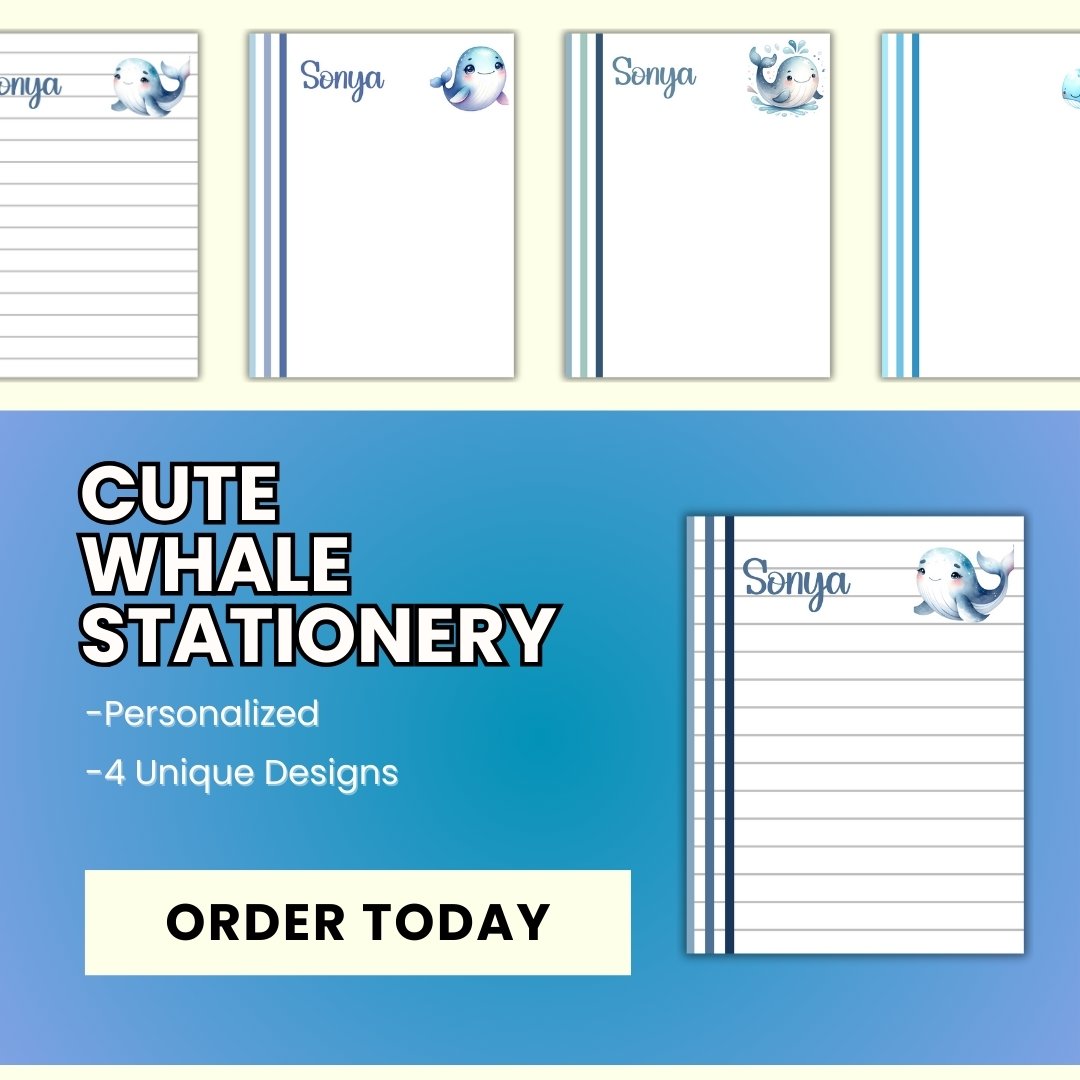 Make a whale of a statement with our adorable stationery! Get your hands on these cute whale designs today and bring a little piece of the ocean into your life. Let's make a splash! 🐳💌 Why wait? Order now! You'll recieve 4 unique sheets of Personalized Whale Notepaper.