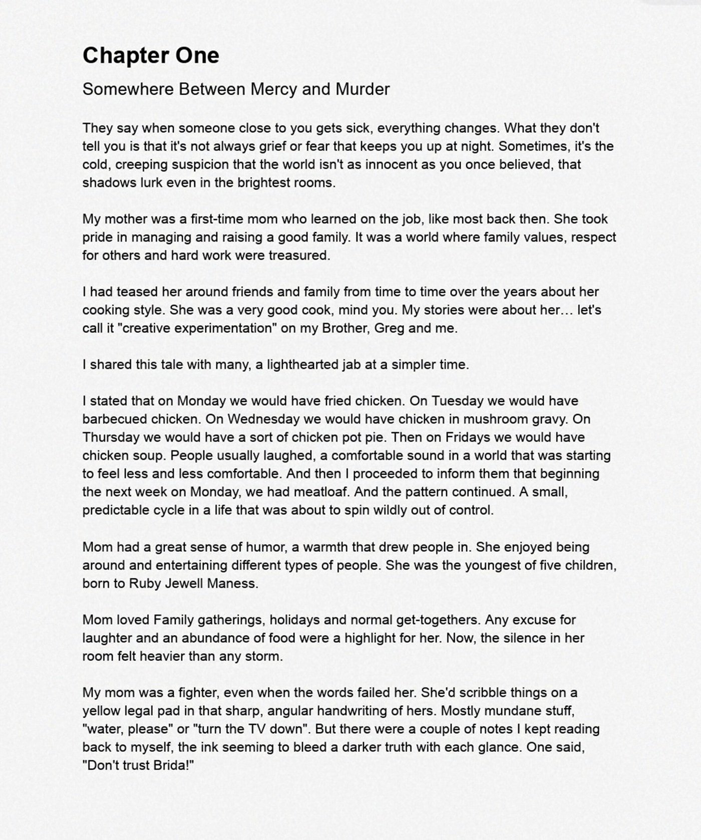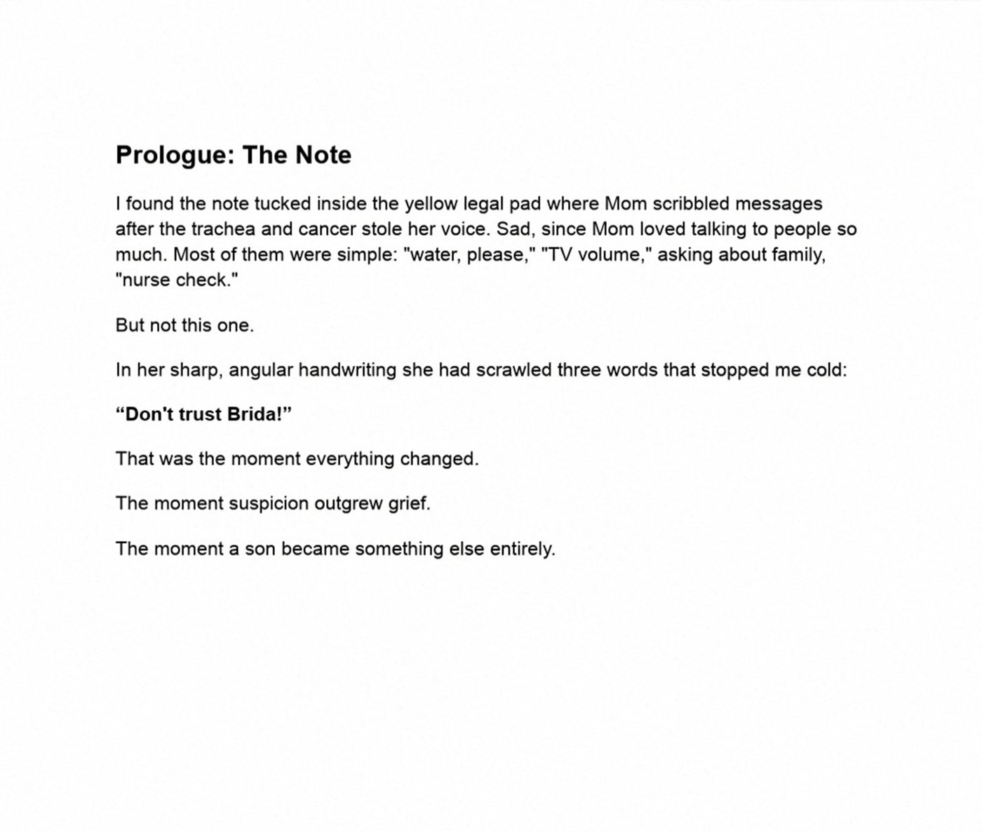 When Jim Steele discovers a chilling note, “Don’t trust Brida!” which was left by his dying mother, grief turns to suspicion. What begins as a tragic loss spirals into a gripping investigation of medical negligence, family betrayal and a possible murder cloaked in compassion.