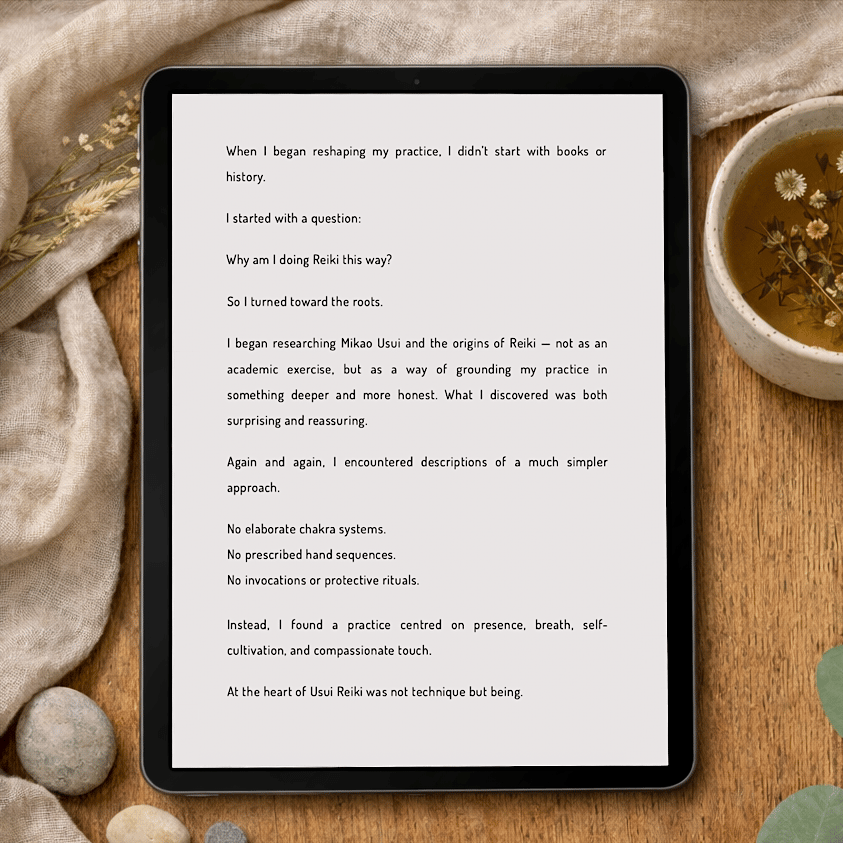 Returning to Reiki: A Practitioner’s Journey Back to Usui’s Simplicity is a quiet invitation back to the heart of Reiki practice — presence, breath, self-cultivation, and compassionate touch.