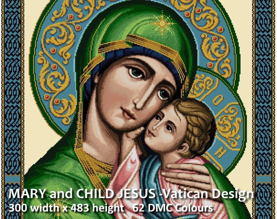 Religious Icon Mama Mary and Child Jesus - Vatican Design (Green) (Red) Cross Stitch PDF Downloadable Pattern