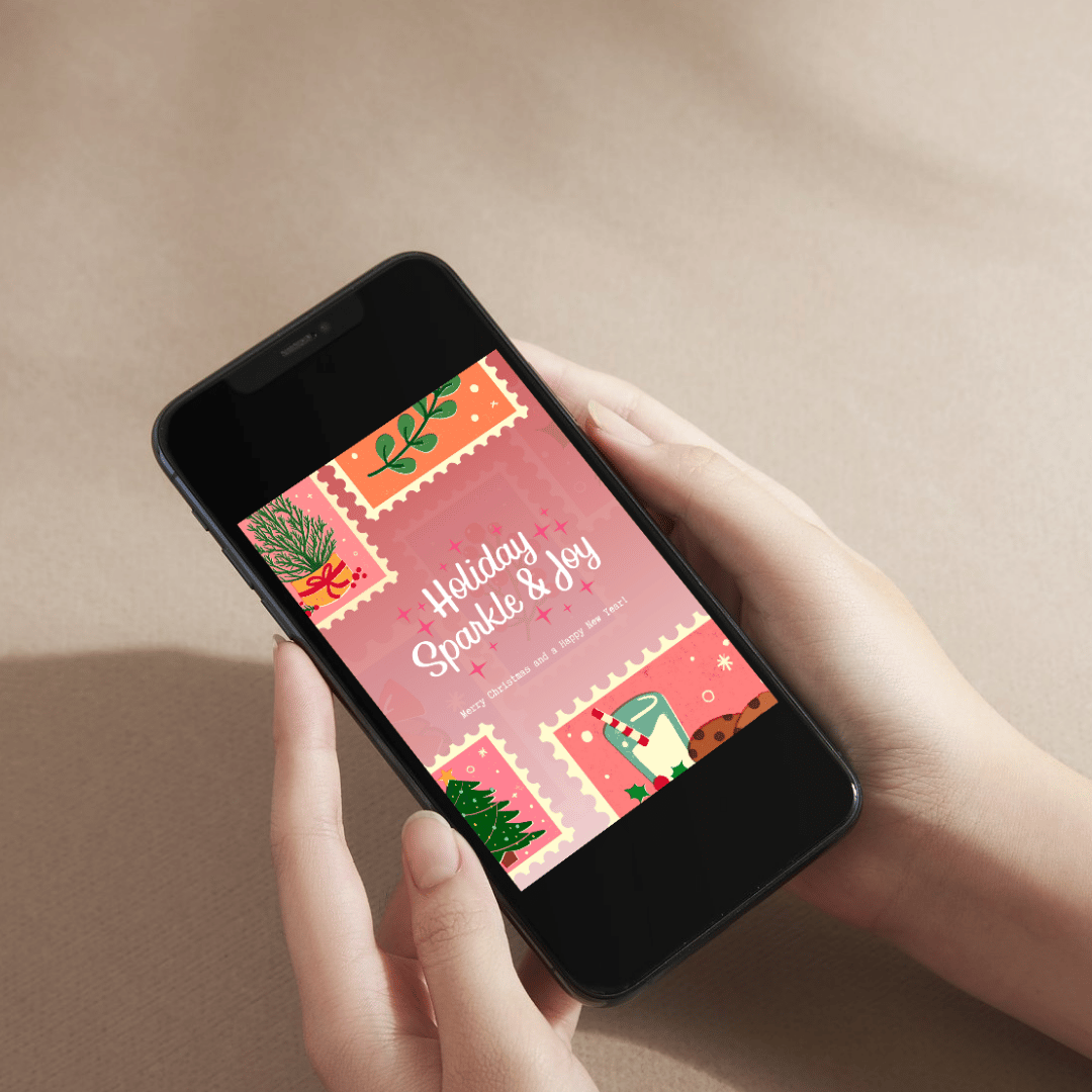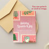 Featuring adorable stamp-style illustrations of holiday elements like a Christmas tree, gifts, cookies, and festive greenery, this design is perfect for sending warm wishes to family and friends.