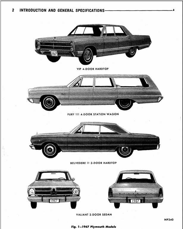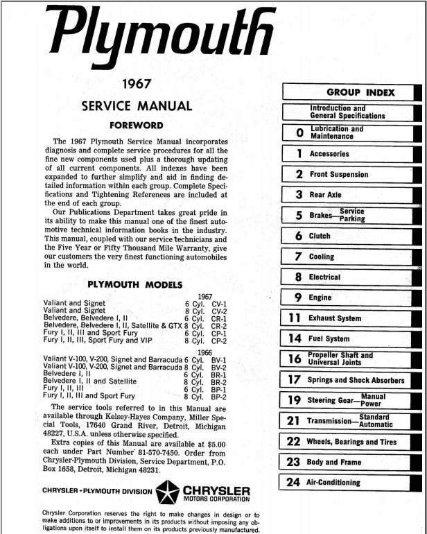 1967 Plymouth Valiant Signet Belvedere Fury Barracuda Service Manual