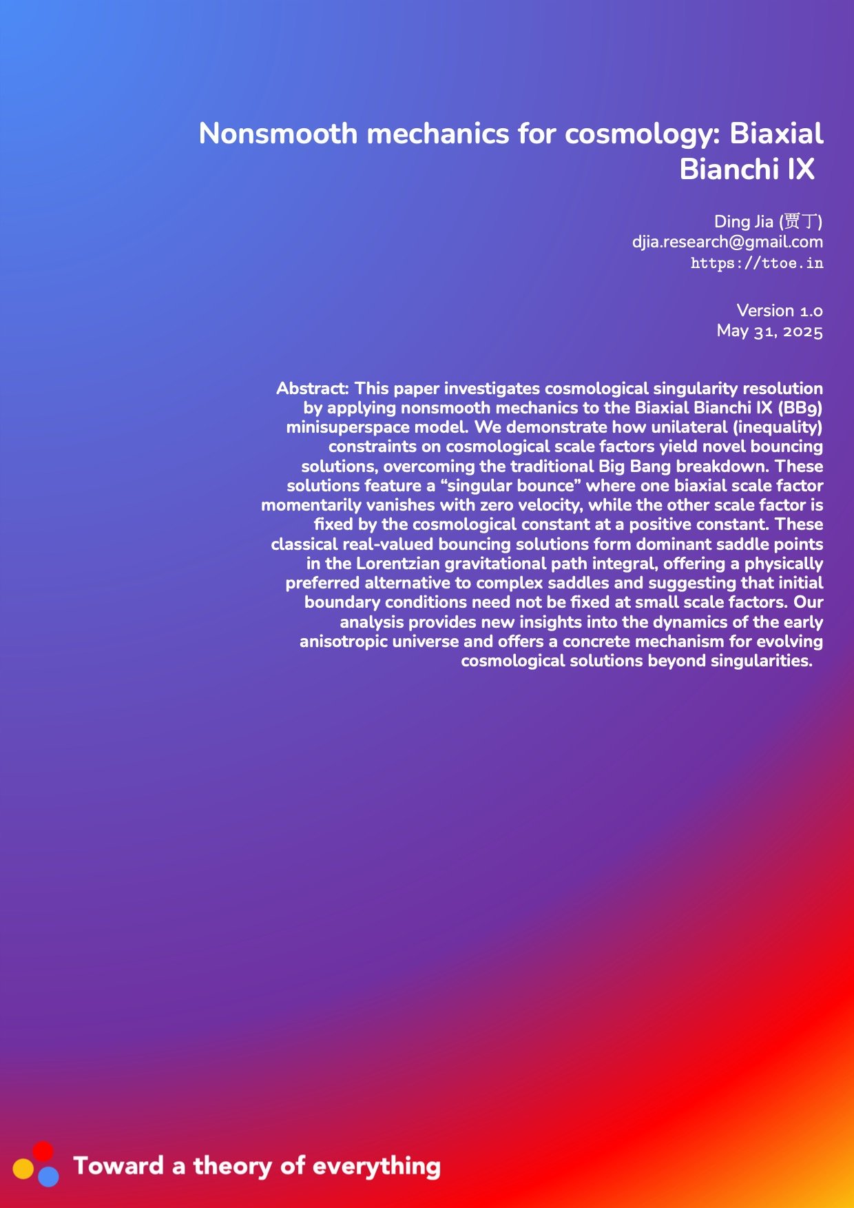 Abstract: This paper investigates cosmological singularity resolution by applying nonsmooth mechanics to the Biaxial Bianchi IX (BB9) minisuperspace model. We demonstrate how unilateral (inequality) constraints on cosmological scale factors yield novel bouncing solutions, overcoming the traditional Big Bang breakdown. These solutions feature a “singular bounce” where one biaxial scale factor momentarily vanishes with zero velocity, while the other scale factor is fixed by the cosmological constant at a positive constant. These classical real-valued bouncing solutions form dominant saddle points in the Lorentzian gravitational path integral, offering a physically preferred alternative to complex saddles and suggesting that initial boundary conditions need not be fixed at small scale factors. Our analysis provides new insights into the dynamics of the early anisotropic universe and offers a concrete mechanism for evolving cosmological solutions beyond singularities.