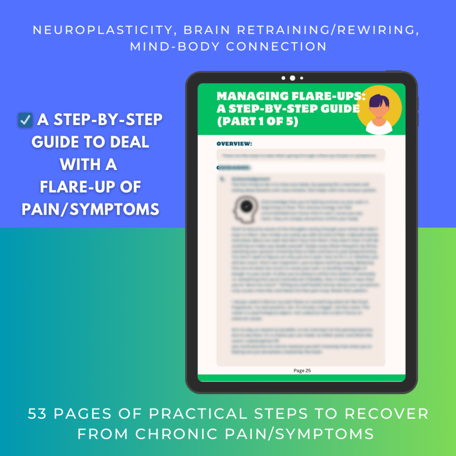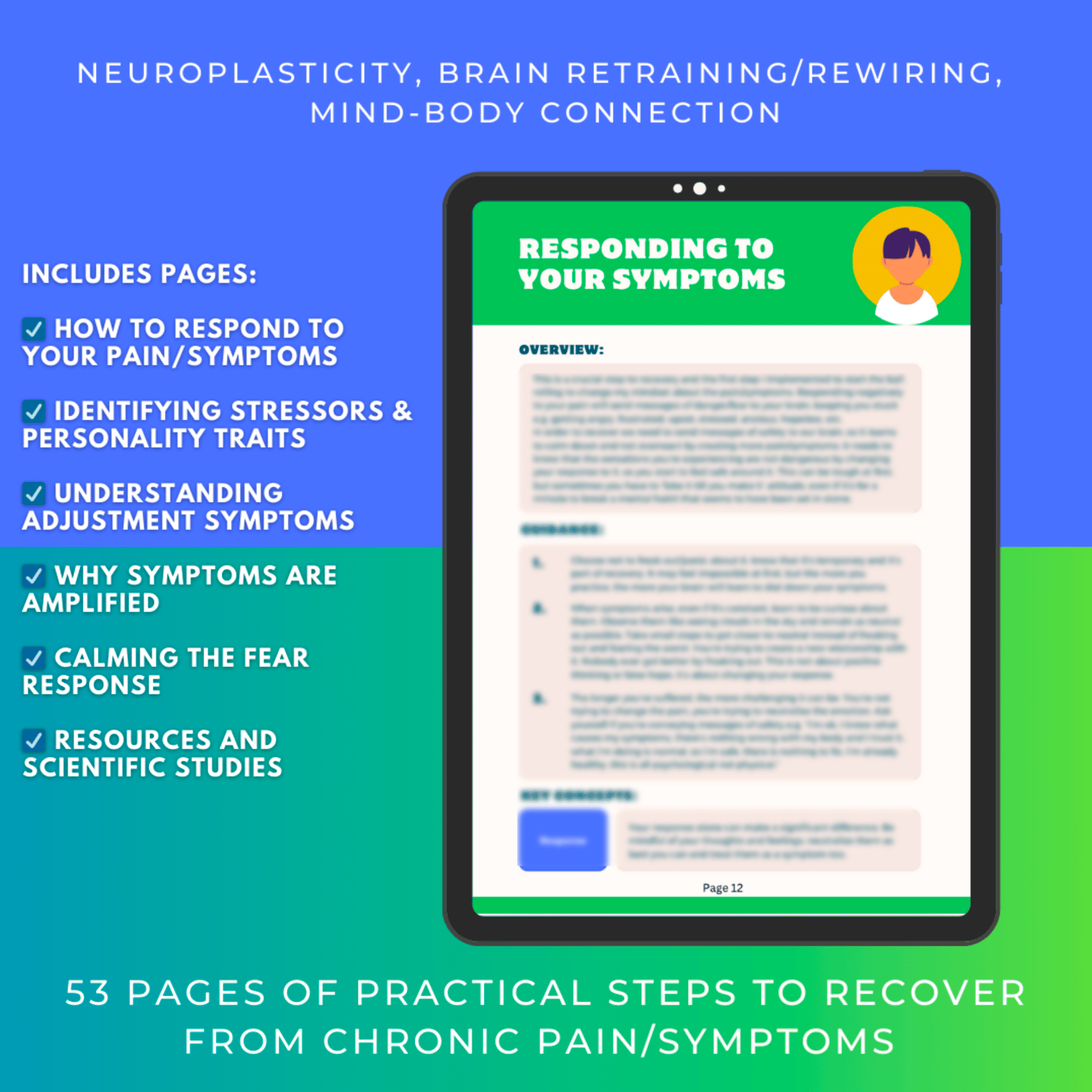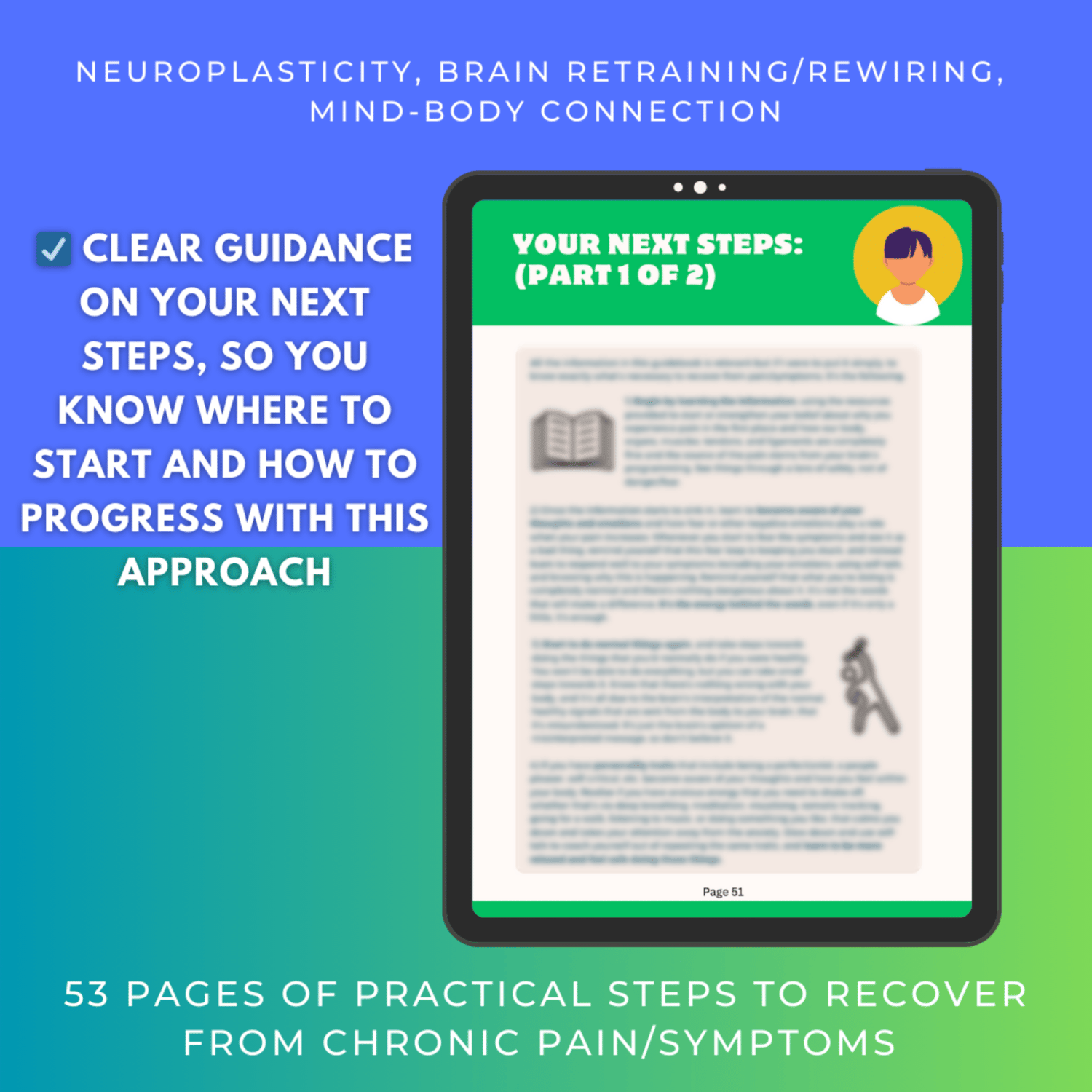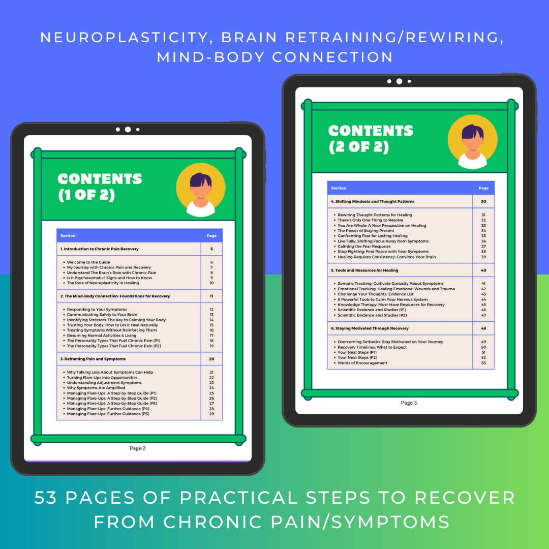 I created this guidebook to share what has helped me on my personal journey with chronic illness. The information is based on neuroplasticity, brain retraining, and the mind-body connection approach, for recovering from chronic pain and symptoms. I’ve taken all the research, tools, and personal experience that worked for me and made it super simple for you to follow.