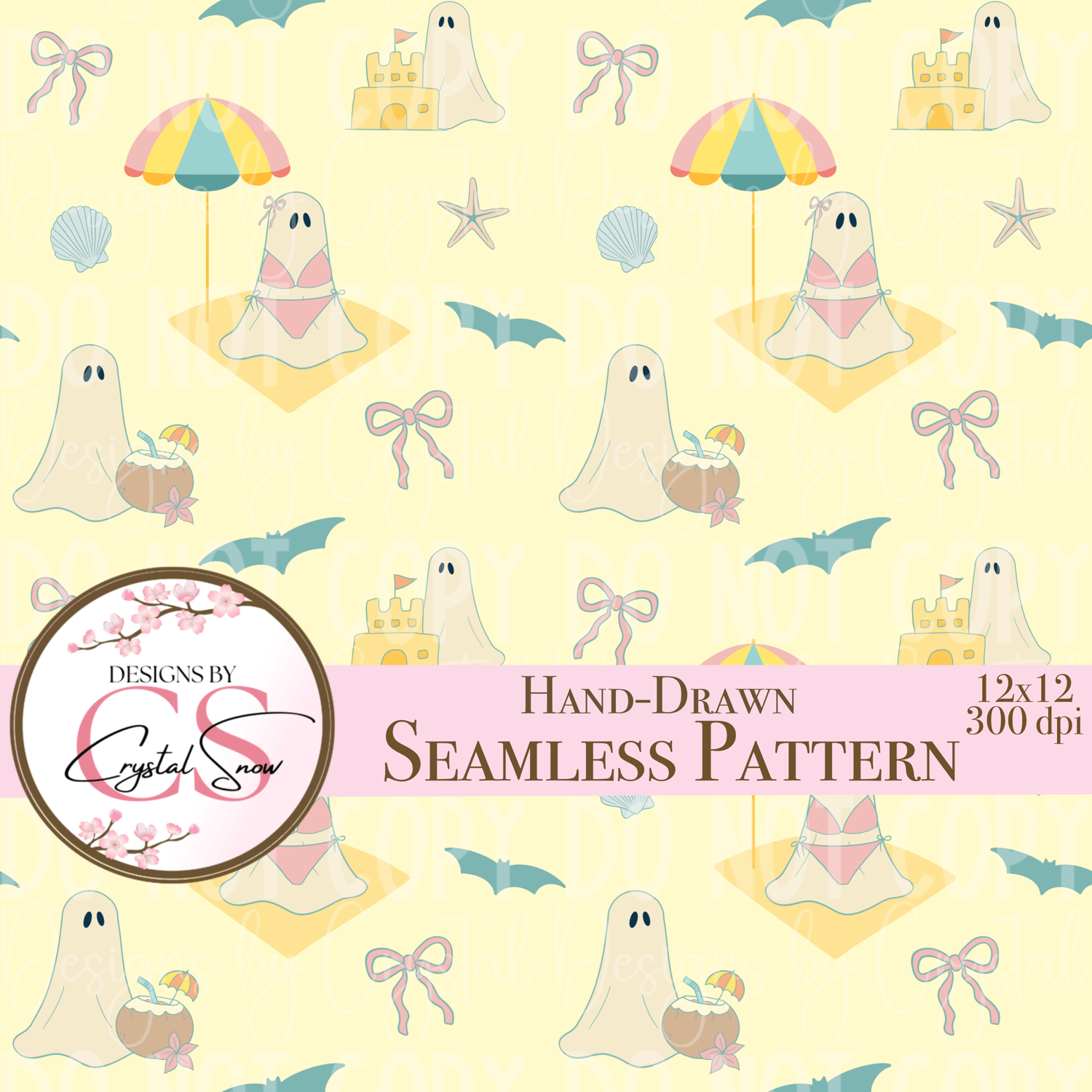 This playful seamless pattern features hand-drawn ghosts soaking up the sun in bikinis and sipping tropical drinks under beach umbrellas—with just the right touch of Halloween flair. Pastel bats, bows, starfish, and sandcastles bring a whimsical vibe to this spooky-summer crossover design.