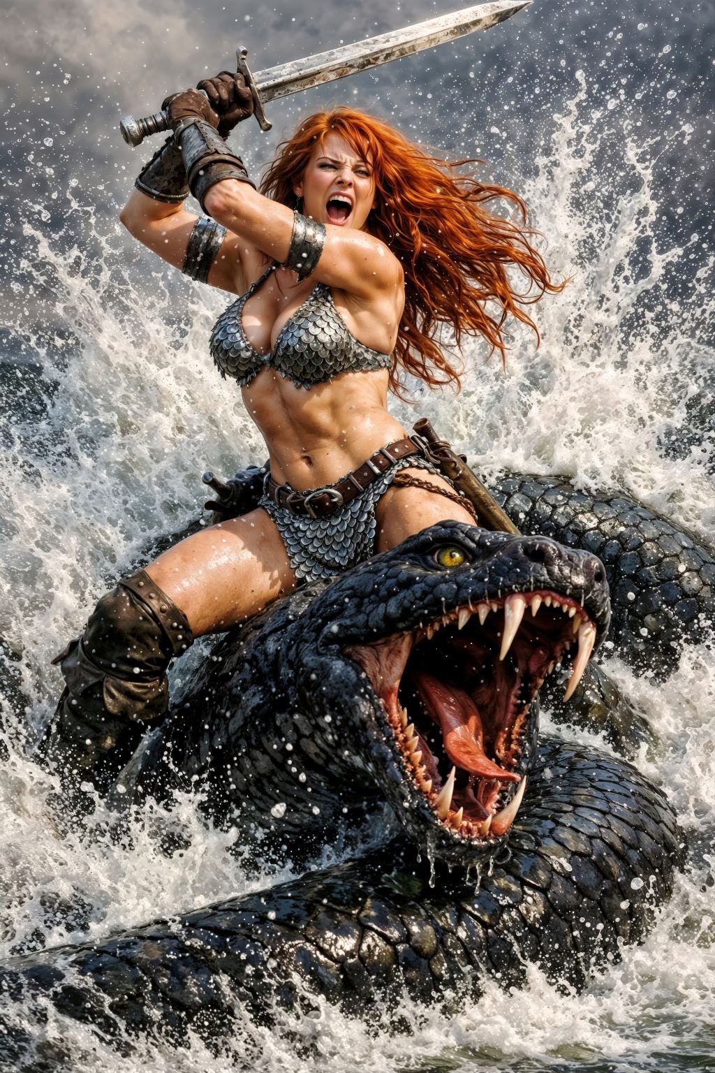 Ferocious, wild, and absolutely unforgettable, this 10K Red Sonja artwork captures the she-devil of the Hyrkanian age in a moment of pure battle fury. Sword raised high above crashing water, Sonja takes on a monstrous sea serpent with fearless rage, blazing red hair, and the unstoppable force that made her a legend.