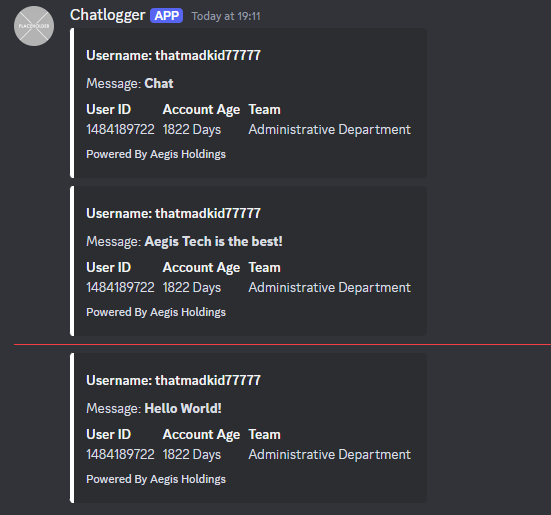 The Aegis Tech Chatlogger is an advanced chat logger system made for all sorts of different projects. Make your games moderation easy with our new chat logger today!