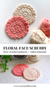 This Floral Face Scrubby is a textured washcloth that is designed to look like a flower. This quick and easy beginner friendly project works up in minutes. It’s no-sew as it’s made in one piece. It comes with a complete video tutorial on the Sweet Softies YouTube channel. If desired, this multi-use design can also be a coaster or circle mug rug!
