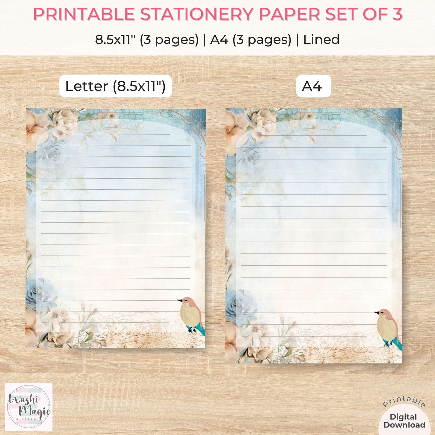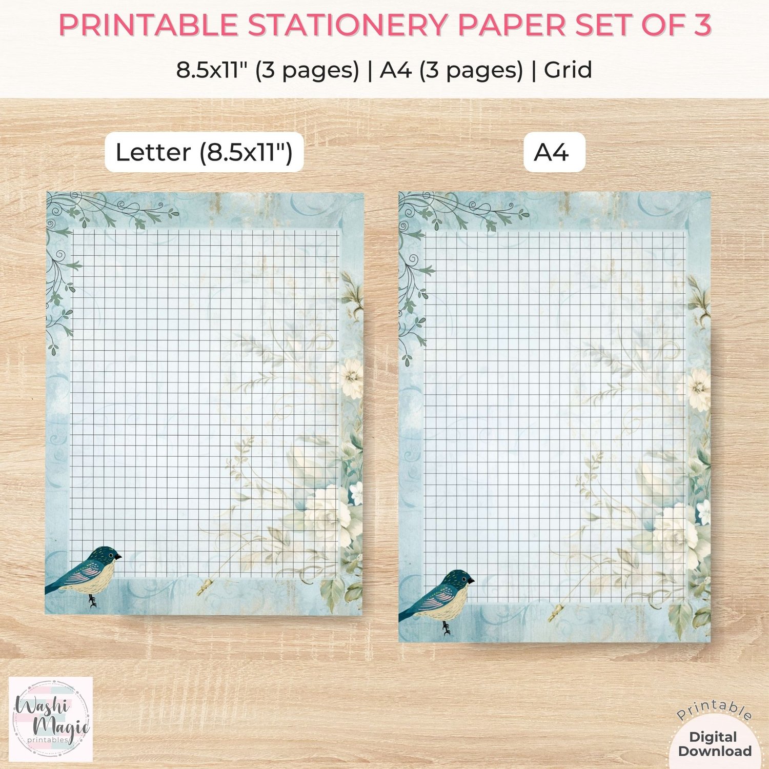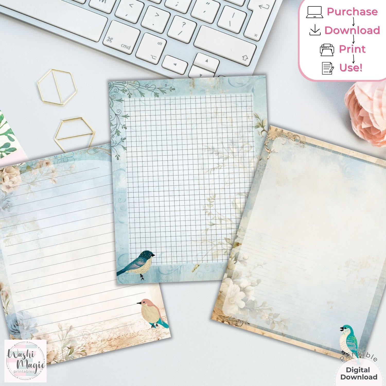 Cherish your correspondence with our printable stationery paper set of 3 including lined, unlined and grid papers, featuring beautiful bird and nostalgic flowers pattern. Perfect for handwritten letters to grandma or special notes to loved ones, this set brings a touch of nature's elegance to your writing.