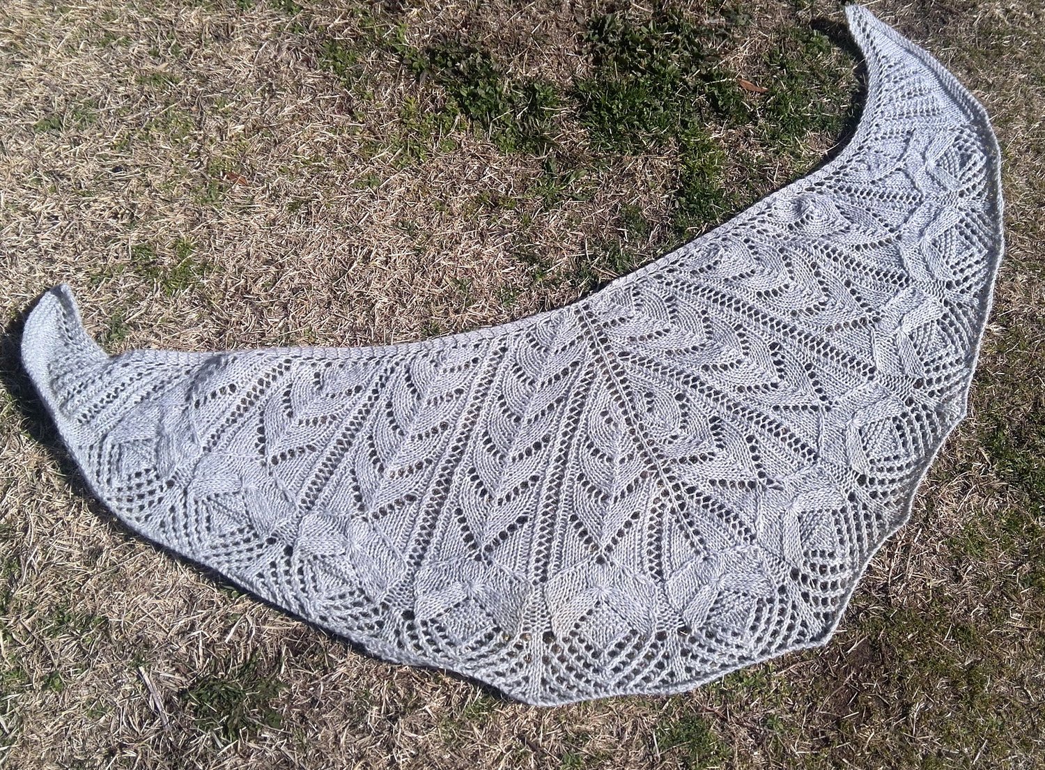 Peronel is a relatively small scarf which starts as an elongated triangle in a simple lace pattern, then is transformed into an elegant crescent by the more challenging border.