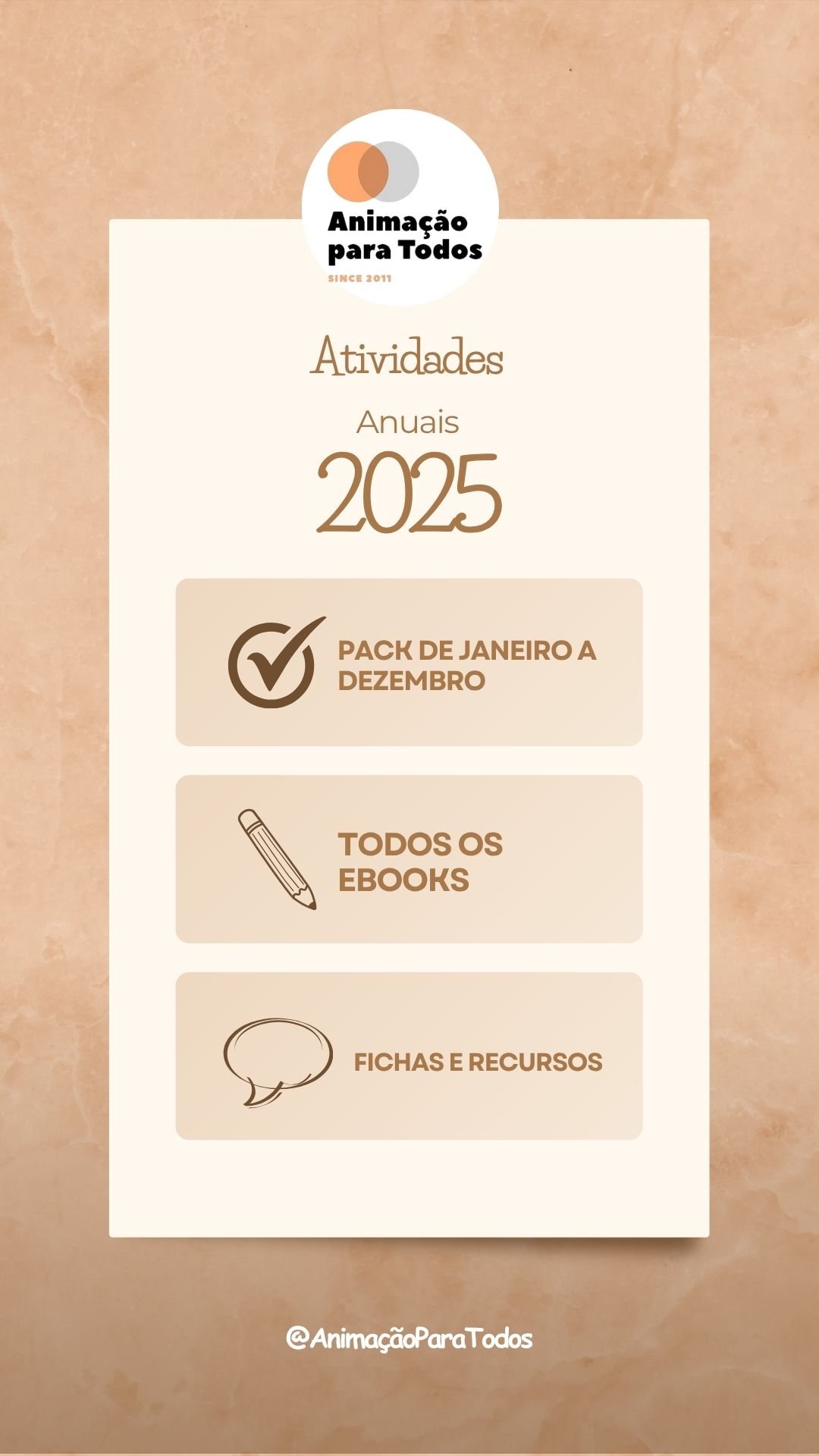 Este conjunto reúne todos os ficheiros, packs de atividades, jogos, PowerPoints, fichas de estimulação cognitiva, recursos profissionais e materiais produzidos pela Animação Para Todos de 2025. É o arquivo completo, organizado e pronto a usar, criado para facilitar o trabalho diário em lares, centros de dia e serviços de apoio a idosos.
