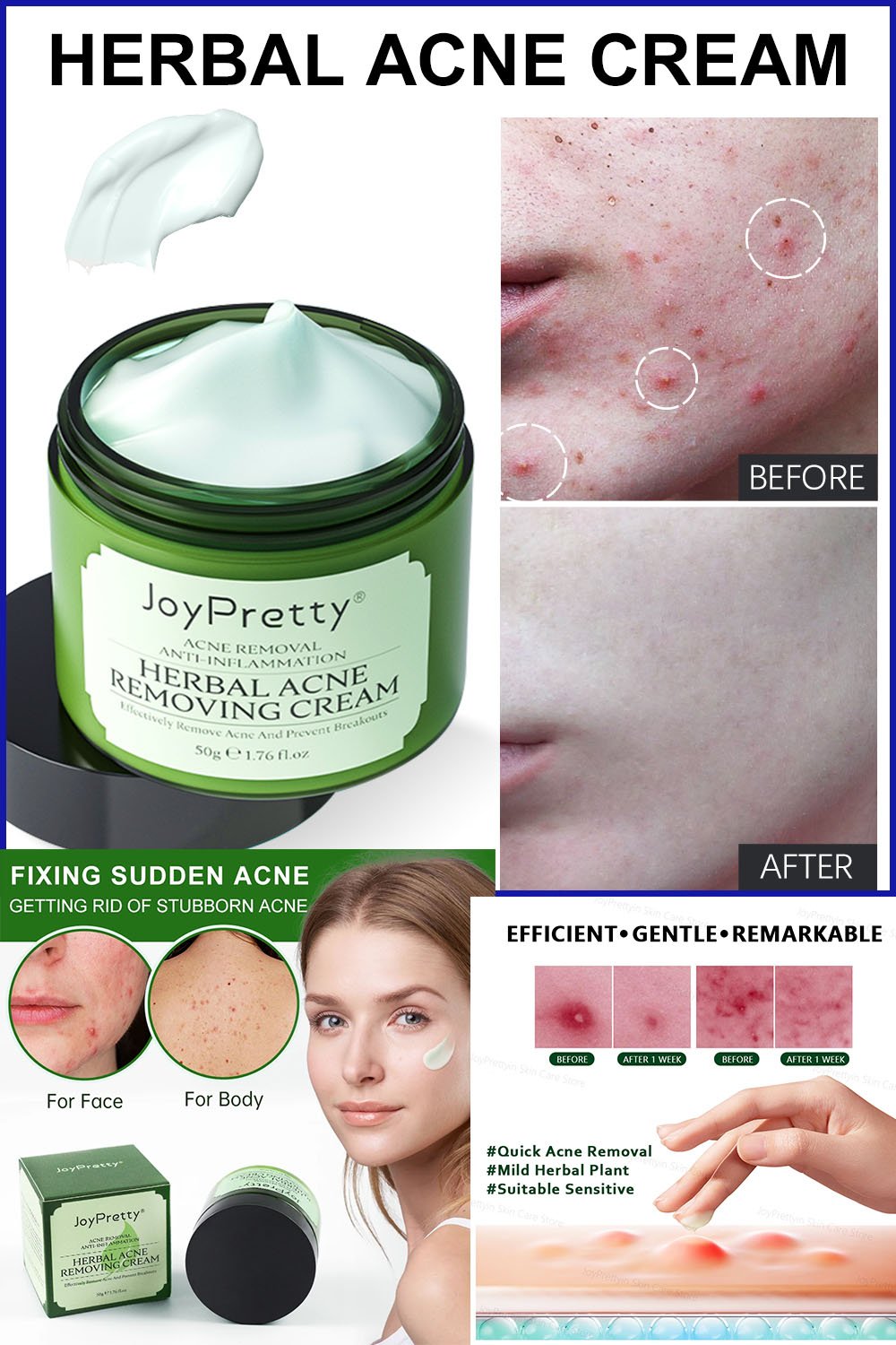 ● JoyPretty Herbal Acne Removing Cream can reach skin bottom due to its excellent osmotic force Toeradicating all kinds of acnes and pimples, white head,Inflamed acnes,hardened acnes, encysted acnes