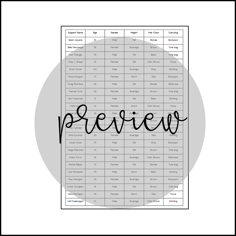 A priceless artifact has been stolen from the Geometric Gallery, and your students are the detectives! Using their knowledge of area and perimeter, they’ll analyze clues, eliminate suspects, and crack the case.