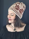 This pattern includes instructions to work a knitted slightly slouchy beanie style hat using the stranded colourwork technique and worked from the bottom rib up with corrugated rib and decrease shaping over the crown.