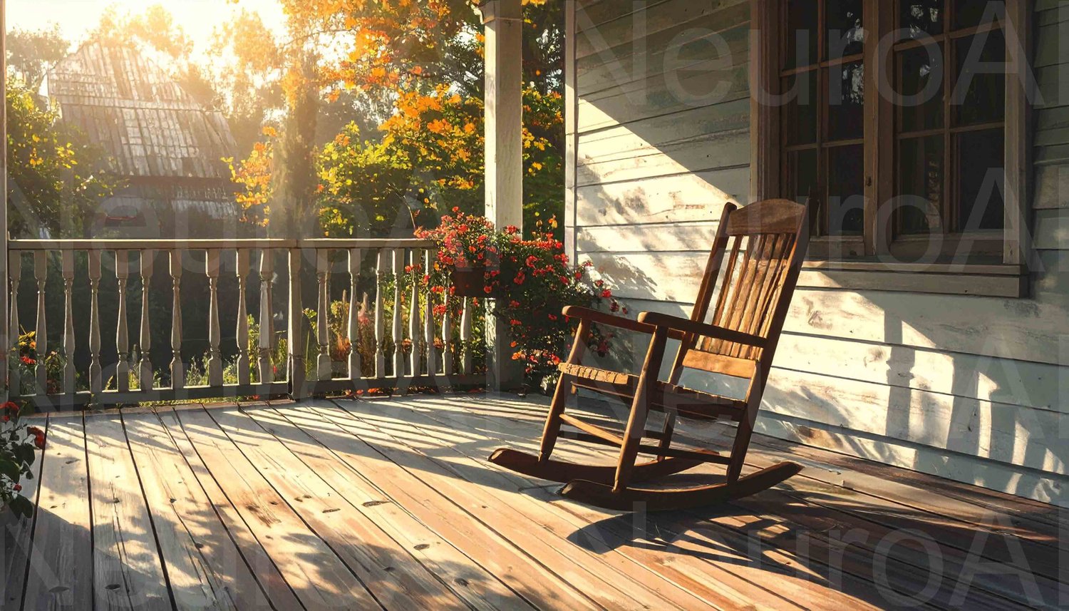 Rocking chair on porch invites autumn relaxation