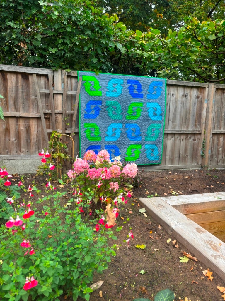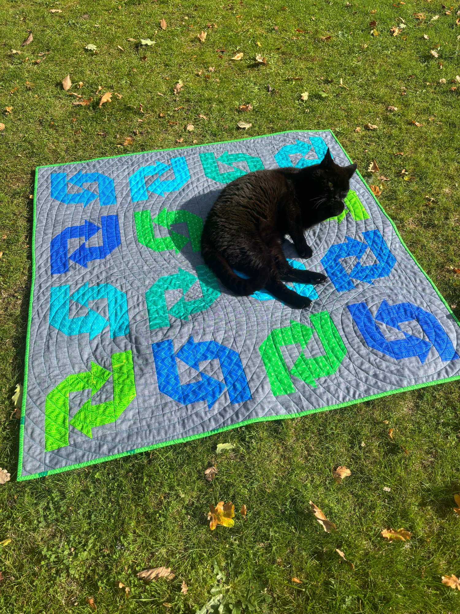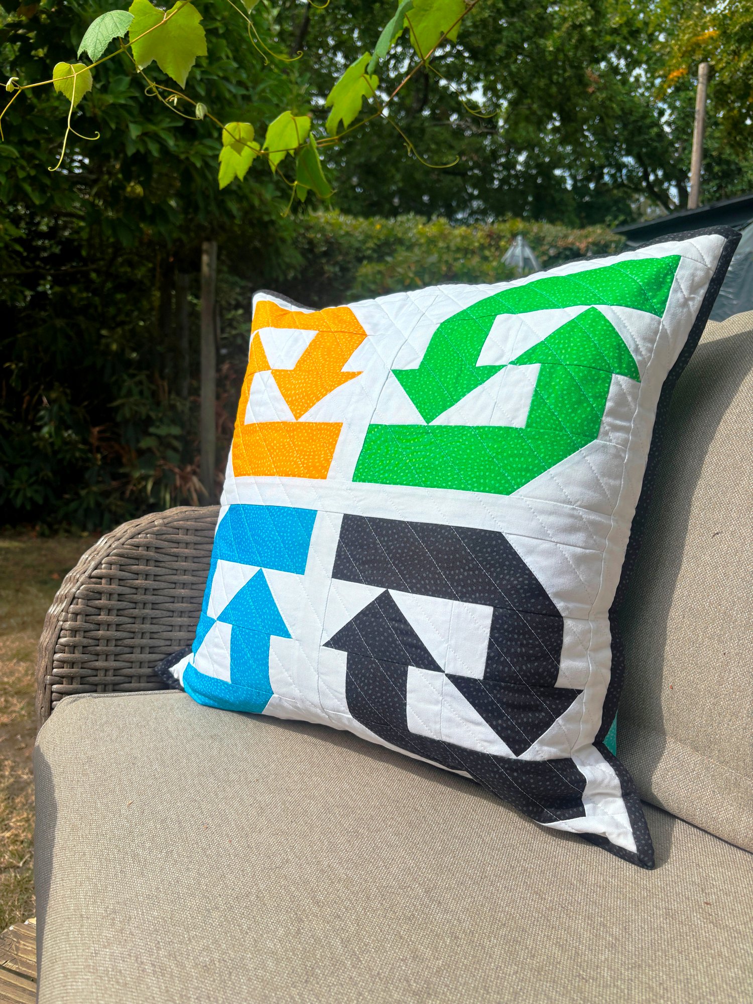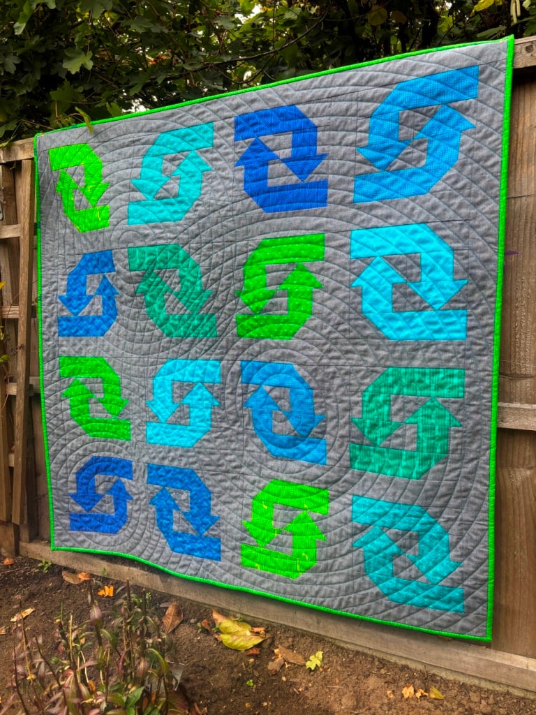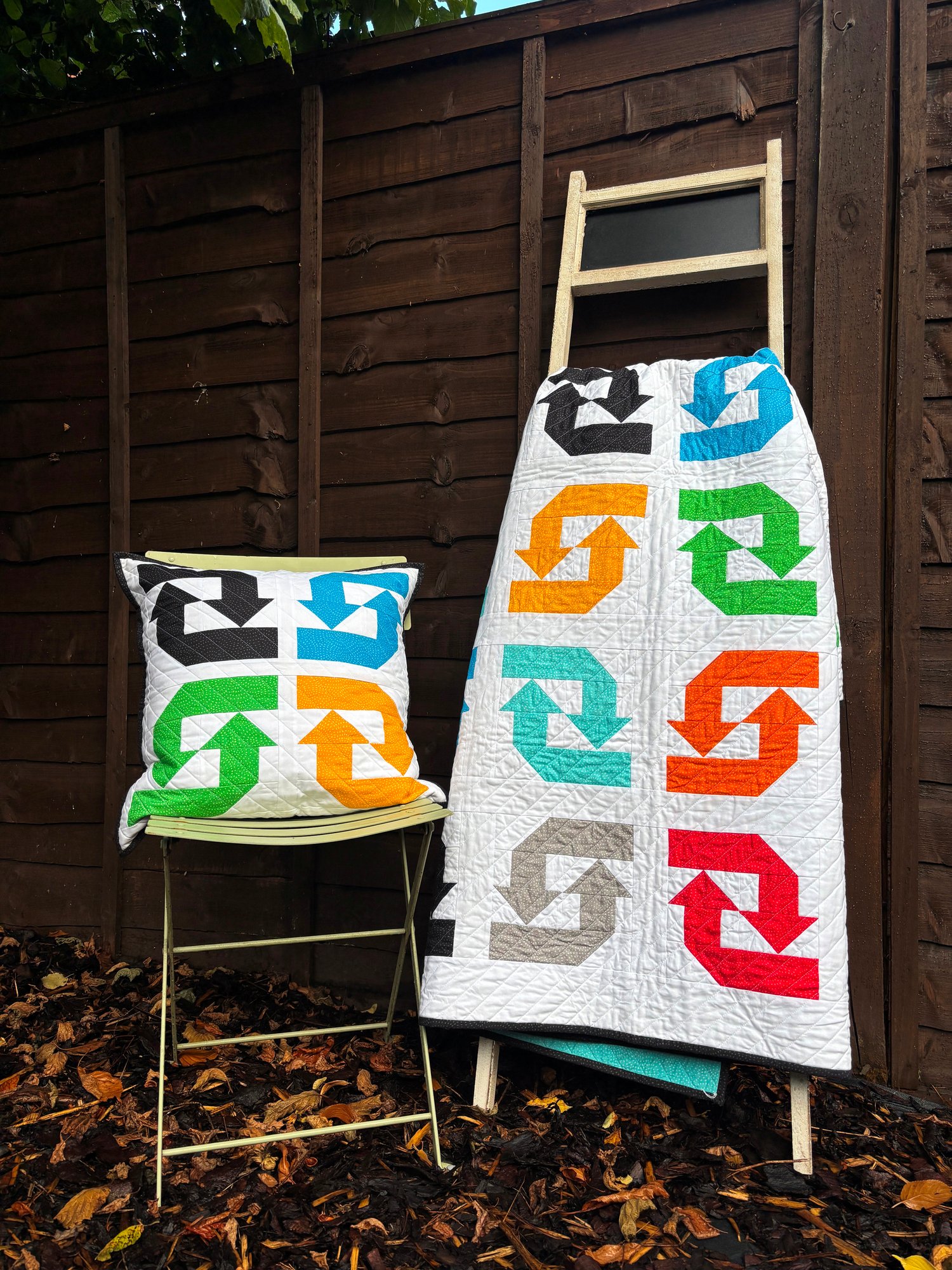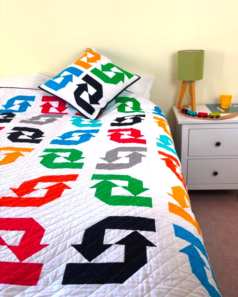 The One Way, or Another quilt design features blocks that have two arrows pointing in a circular direction. It’s a fun, repeating block pattern that features two arrows pointing in a circular direction. The blocks are mirrored throughout the design with half pointing clockwise and the other half pointing anti-clockwise, hence the name: One Way, or Another.