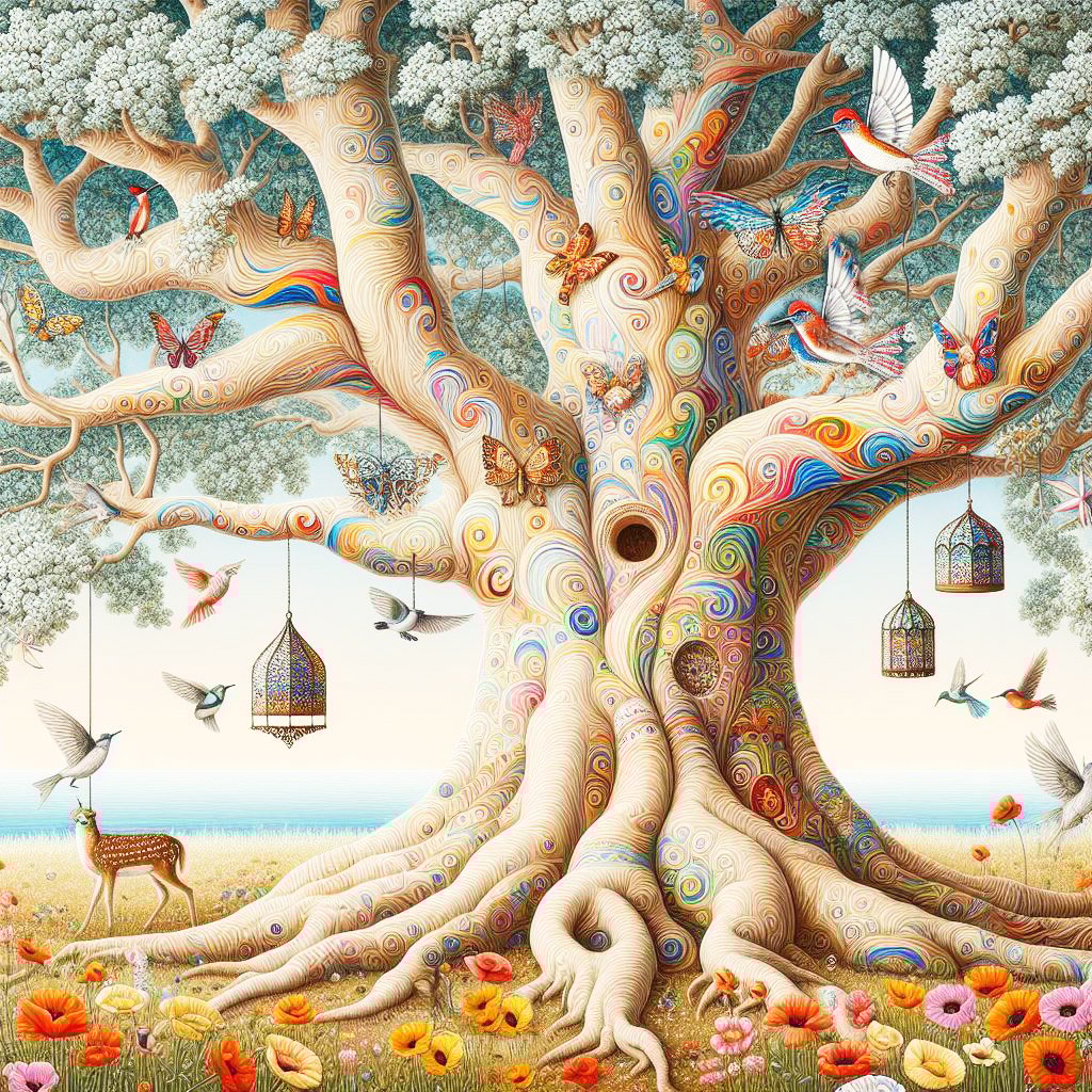A big old white oak tree, with elaborate patterns throughout. It has deep roots & curly branches with white & green leaves. It has beautiful glass bird houses hanging from its branches. There are colourful humming birds & robins. On the ground there are poppies & sunflowers & the tree is surrounded by a lake. A deer lies amongst the flowers.