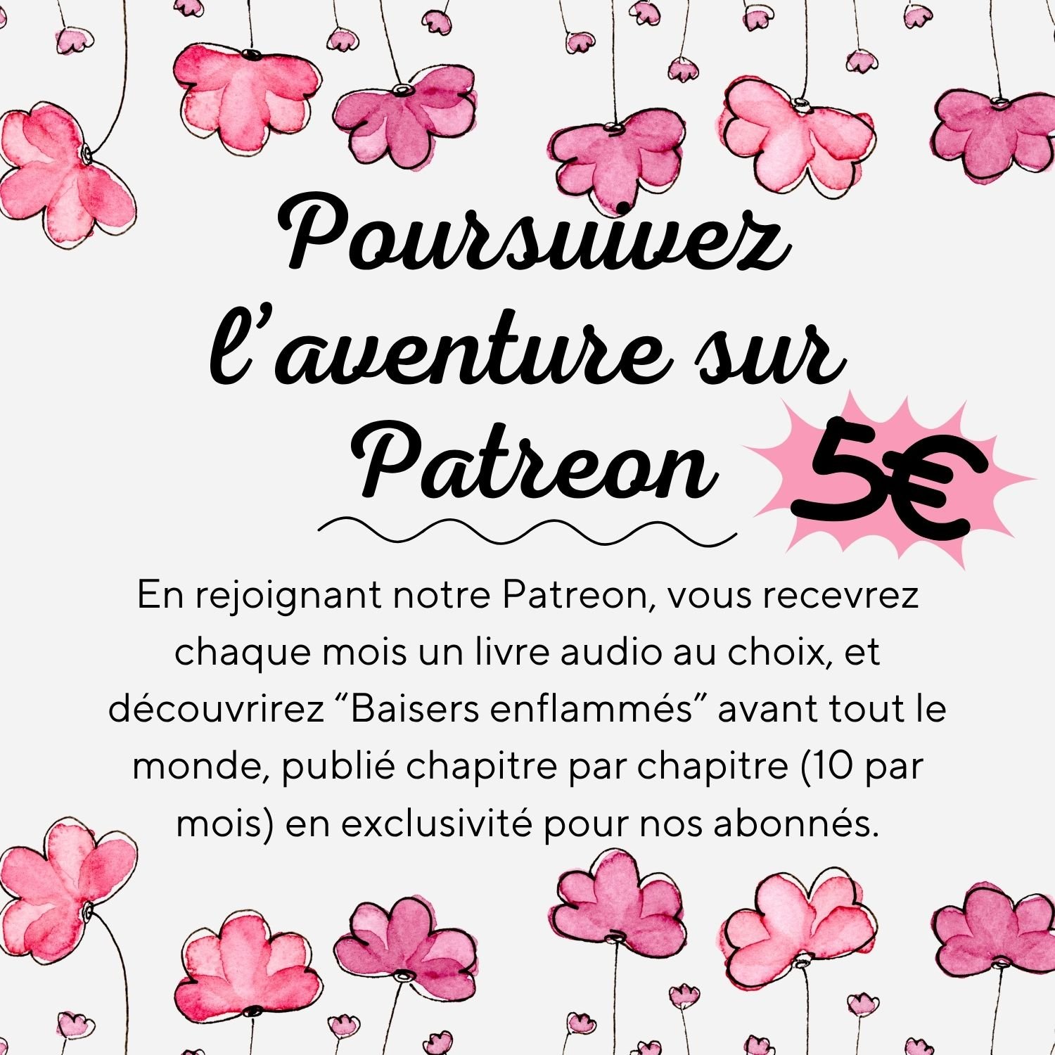 En rejoignant notre Patreon, vous recevrez chaque mois un livre audio au choix, et découvrirez “Baisers enflammés” avant tout le monde, publié chapitre par chapitre (10 par mois) en exclusivité pour nos abonnés.