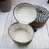 Disclaimer: This is one of my few patterns with a template. It is only for the lid and base ovals (they are a little tricky). The rest of the pattern is measure and cut. I just wanted to let you know up front that the templates may not be what you might be expecting- in the true spirit of old-school designing, the template is precisely HAND drawn. This does not affect its quality or function. It fits together 100% perfectly and a lot of people have bought and made this pattern successfully and beautifully. There is a sizing square on the template to help you to size it just right when you print. I love the organic and creative feeling that this gives me. The pattern really is hand made.