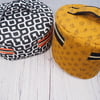 Finished Sizes: the smaller (mustard) version is 7” tall x 9” wide x 7” deep and the larger, flatter version (the black and white) is 4 ¾” tall x 10 ½” wide x 9” deep.