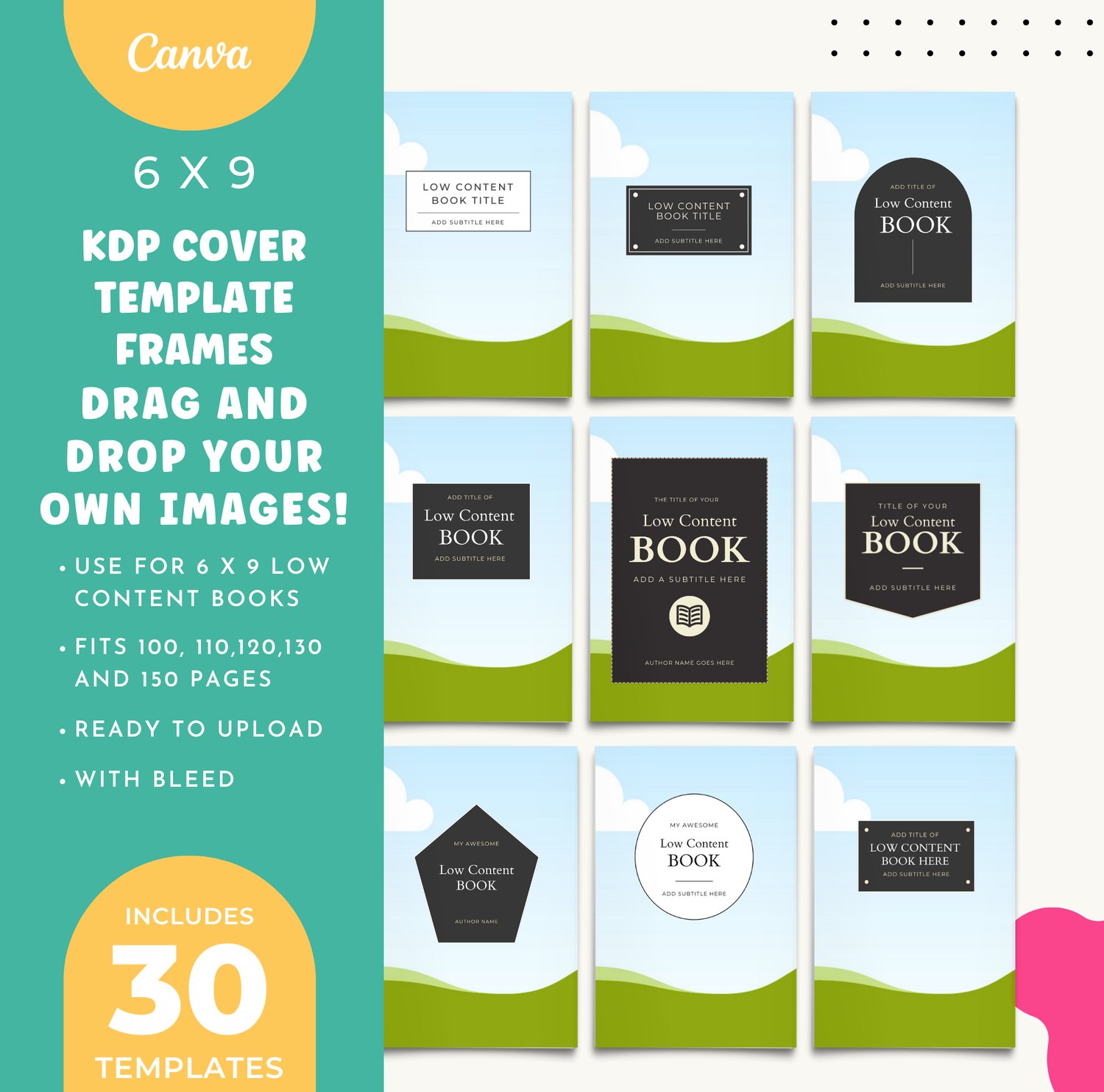 30 KDP 6 x 9 Canva Frames Bundle for Notebooks, Journals & More | Drag and Drop Fillable Templates for 100, 110, 120, 130, 150 Pages