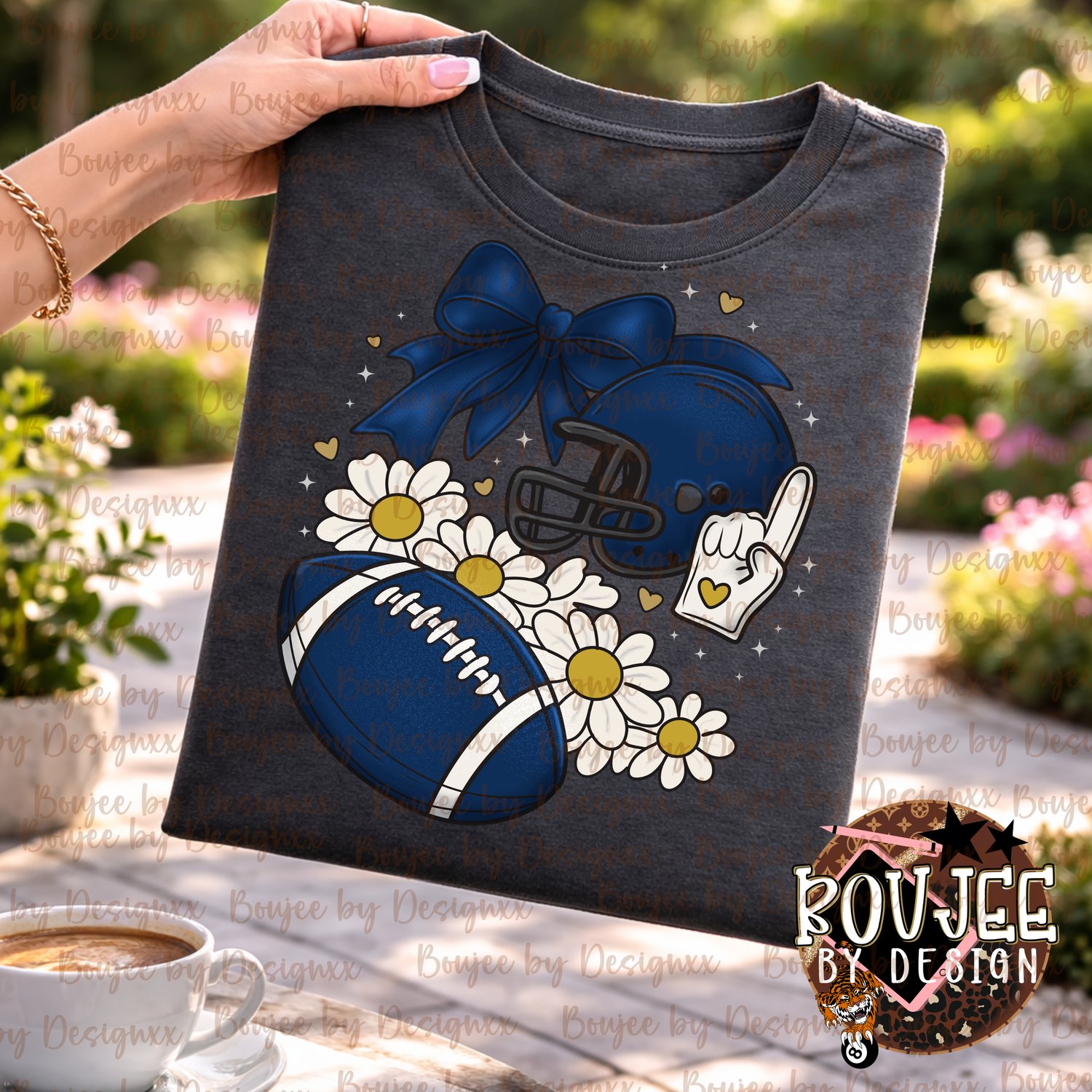 This hand-drawn girly football design features a bold blue helmet, oversized bow, football, daisies, and foam finger accents — perfect for stylish game day tees.