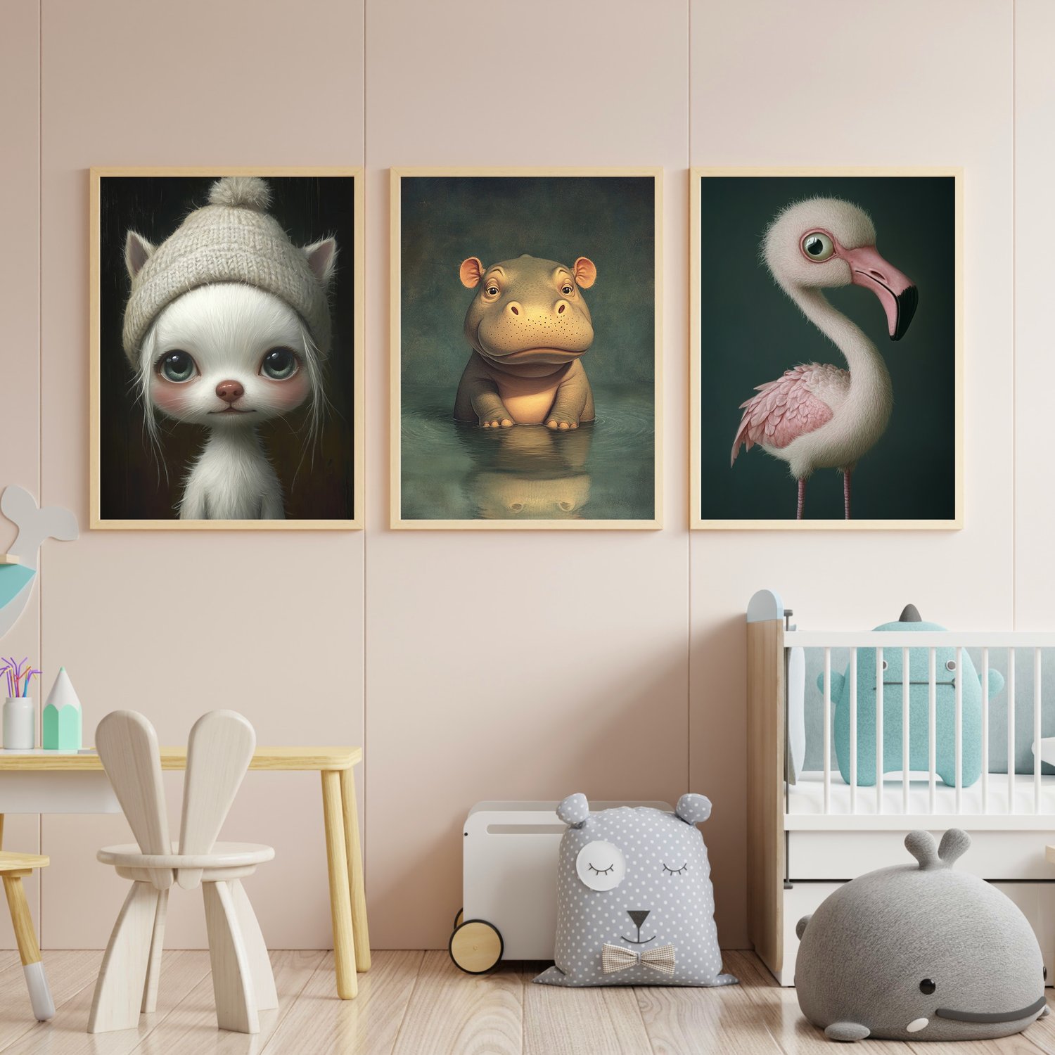 (Cute dog with winter hat, Cute hippo, Cute baby flamingo)
