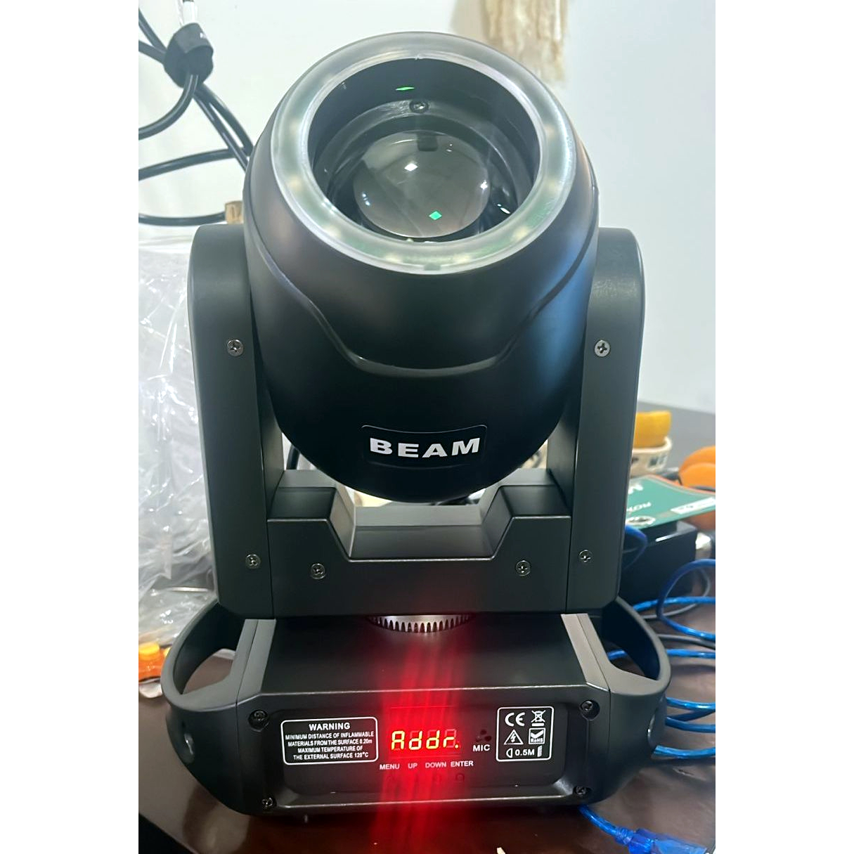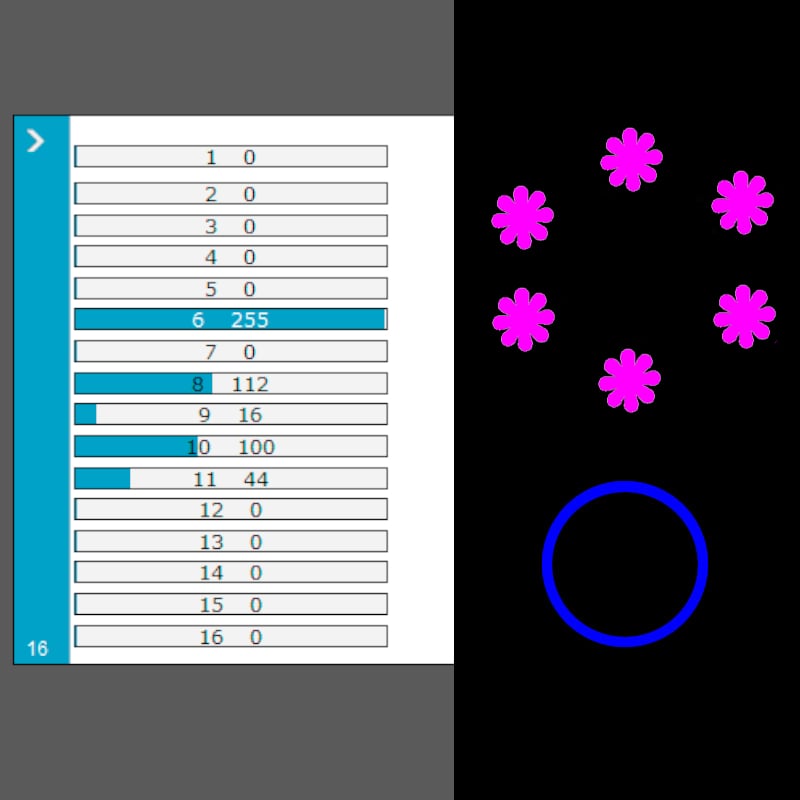 * Verifique, con un Fixture de pruebas (click), que coincidan estos canales: 6 Dimmer, 8 en el valor 112 = Color Magenta, 10 Prisma, 9 en el valor 16 = Gobo de la tercer foto, 11 en el valor 44 = Aro Led en Color Azul, 15 en el valor 255 por 5 segundos = Reset.