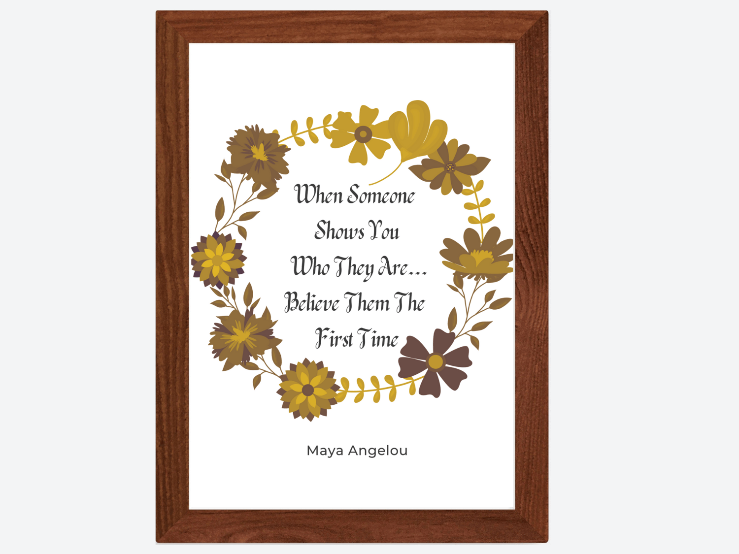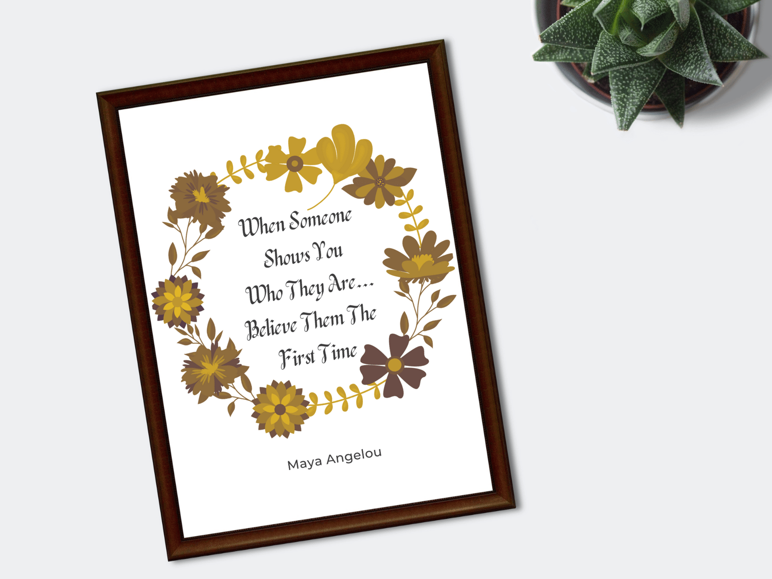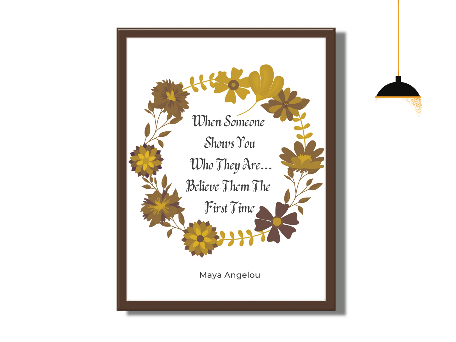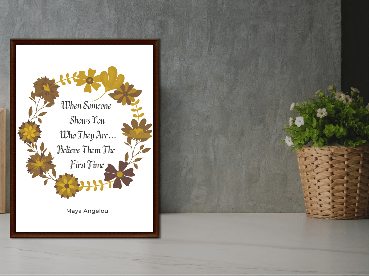 This timeless Maya Angelou inspirational quote is about perception, and how difficult it can be to overcome our preconceived ideas about someone. This quote is about believing what a person demonstrates themselves to be, regardless of who they claim they are or who we want them to be. This offering reminds us to believe what is being demonstrated to us the very first time. Inspiring Digital's are designed to transform, uplift, and inspire. The spoken word is like a wand and when used correctly never ceases to inspire changes from the inside out. It would make a terrific birthday gift for friends and family, or indeed any person who may be venturing into the magical world of transformative quotes and affirmations for the first time. It would also make a great gift for yourself. This digital art print will look great in your Living Room, Office, Bedroom, Kitchen, Bathroom, or wherever you want a reminder of how powerful the spoken word can be. Since it comes in 3 sizes, it's very versatile. And since it's a digital download, it's the most affordable way to decorate!