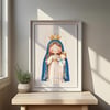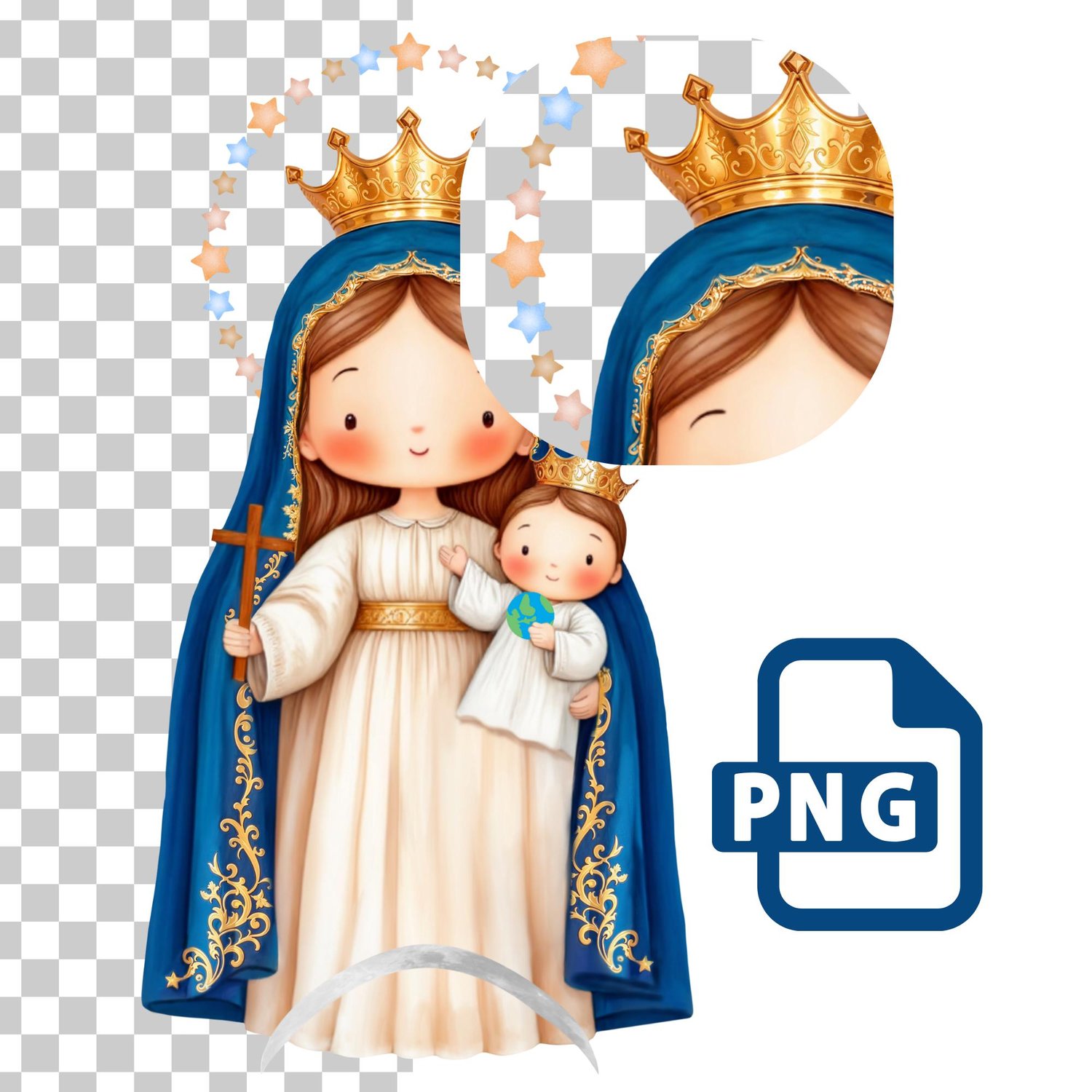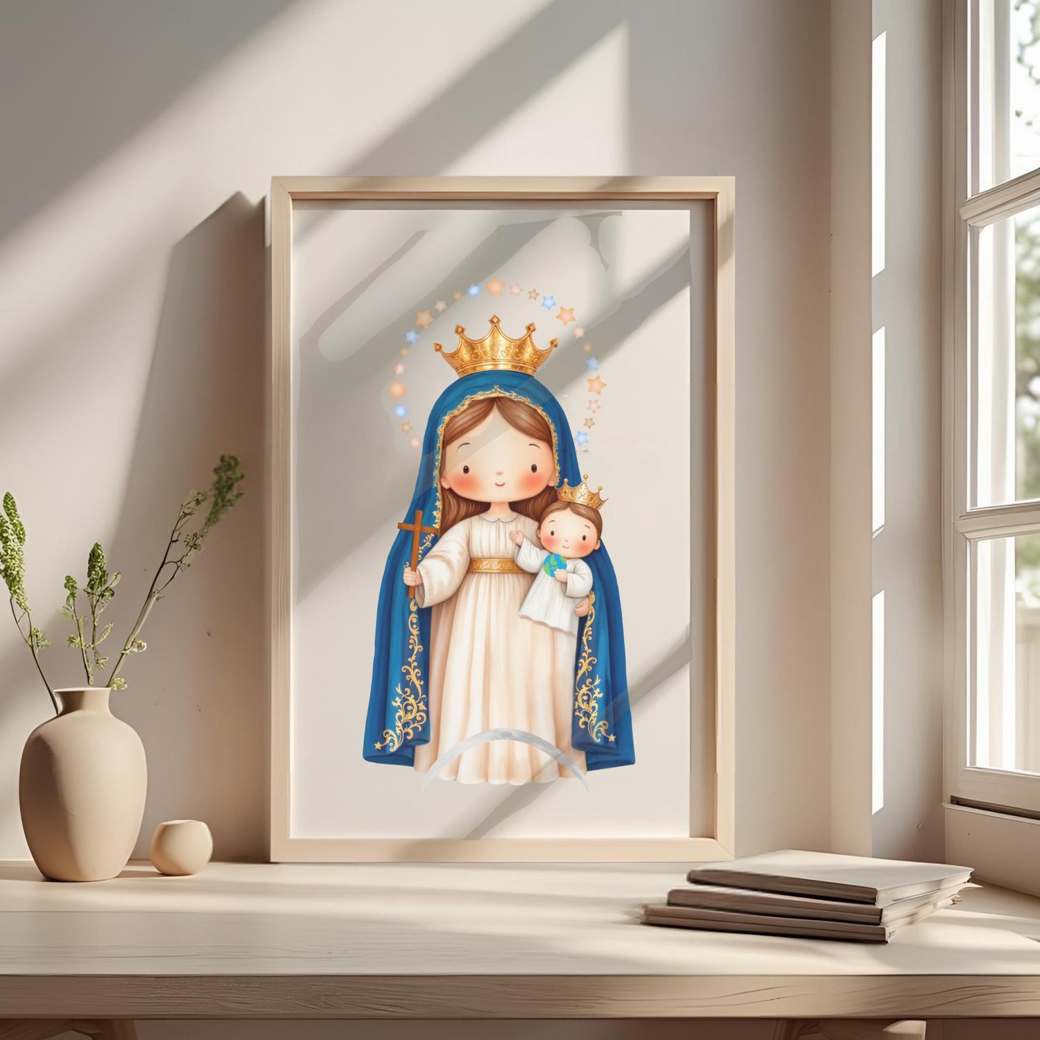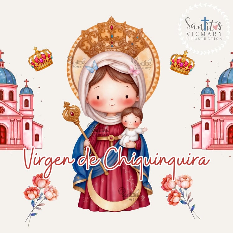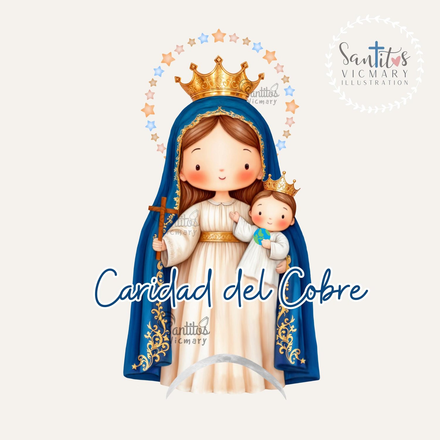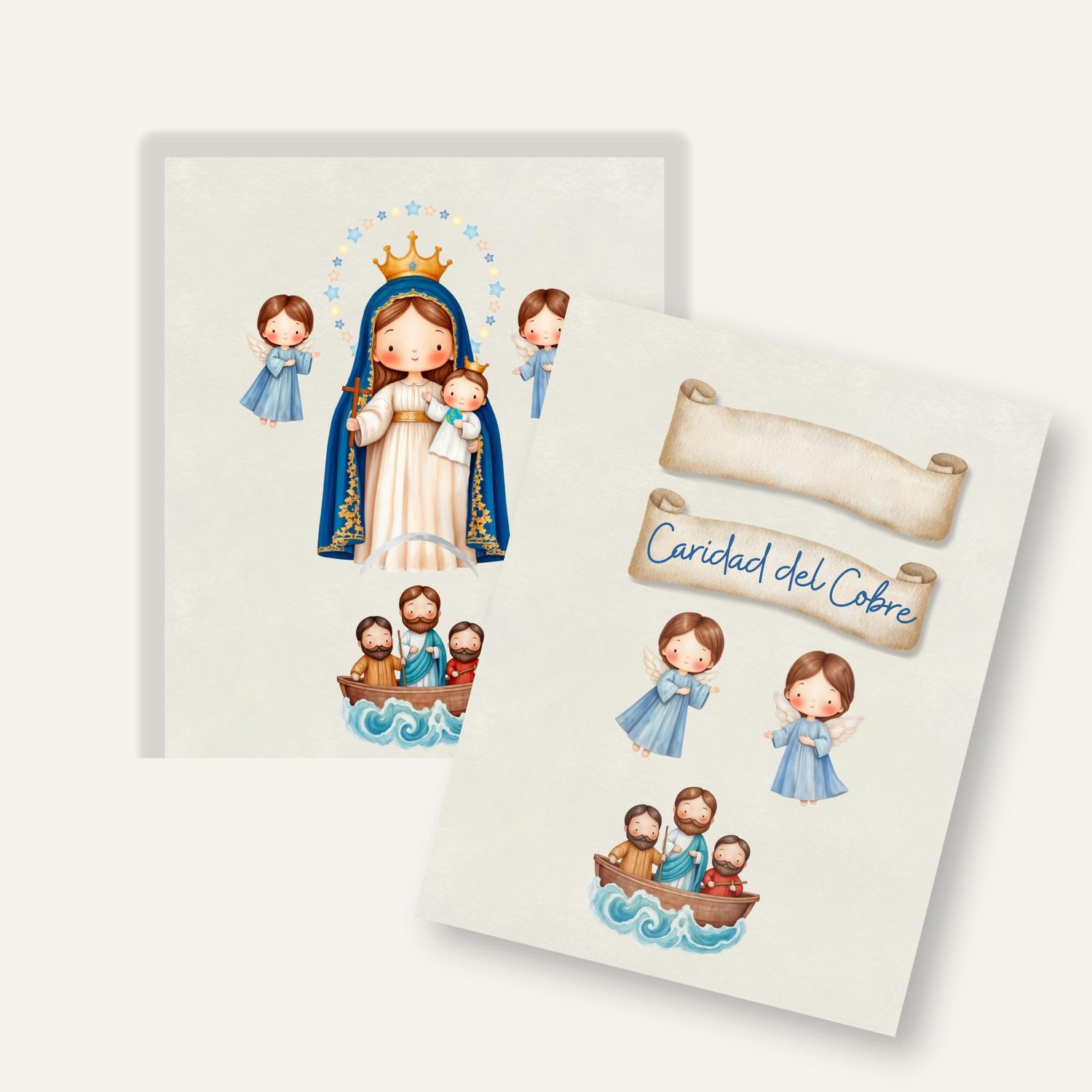 1x Ilustración principal de la Virgen de la Caridad del Cobre: Una imagen de la Virgen María con el Niño Jesús, de pie sobre una base que simboliza su aparición en el mar, en un estilo dulce y moderno. Ideal para estampitas, oraciones, recordatorios y más.
